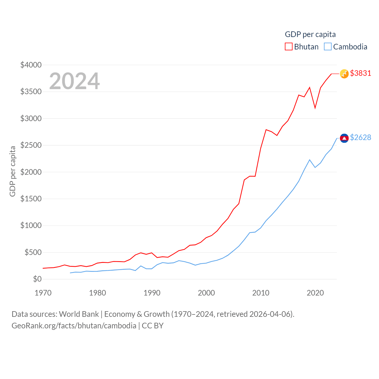 By GDP, Bhutan ranks 170/197 ($3.01B) and Cambodia ranks 97/197 ($46.4B). By GDP per capita, Bhutan ranks 132/197 ($3,831), while Cambodia ranks 145/197 ($2,628).
