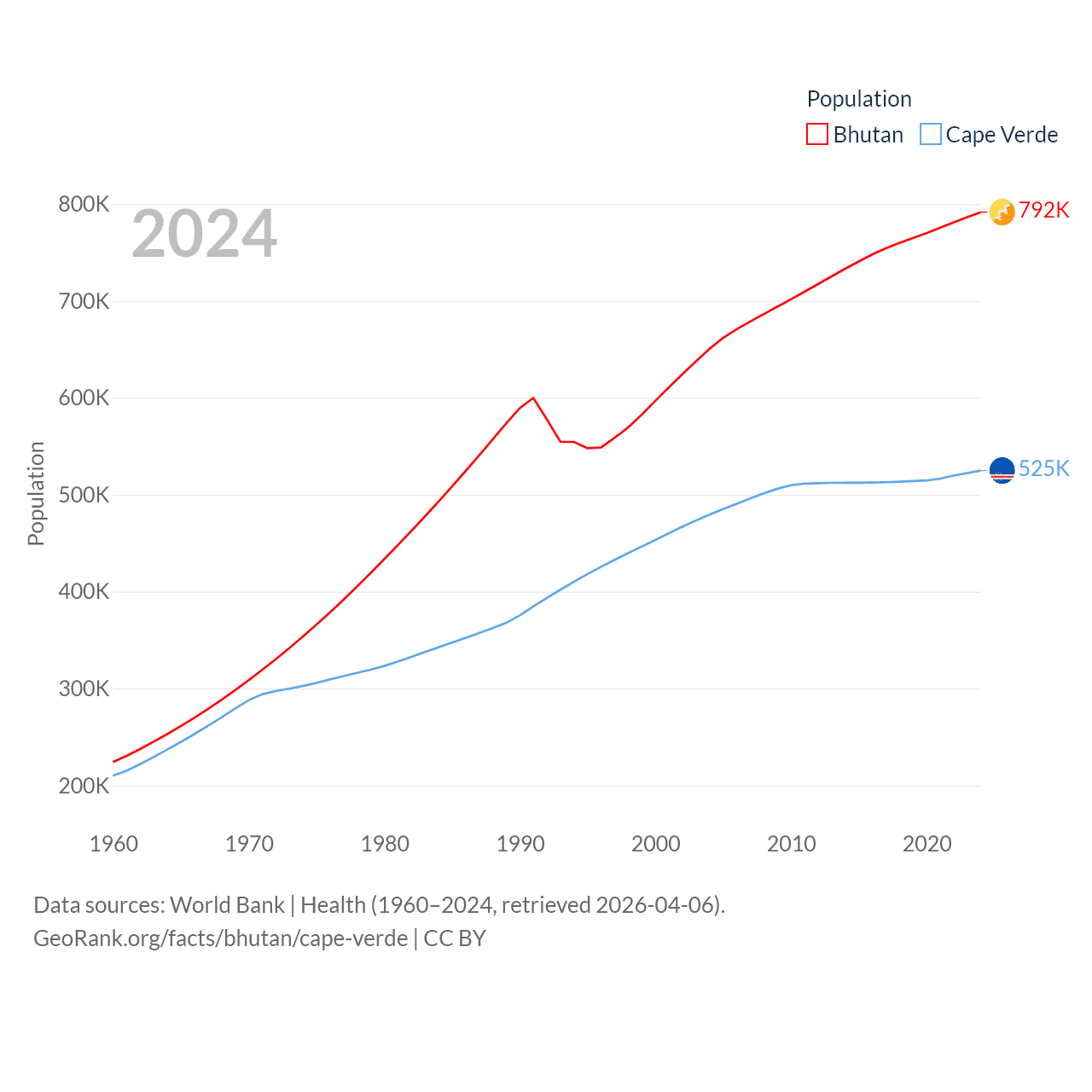 Bhutan has a population of 792K (ranked 163/197), compared with 525K in Cape Verde (ranked 169/197). Bhutan's land area is 14,726 sq mi versus 1,556 sq mi for Cape Verde (ranked 132nd vs. 167th).