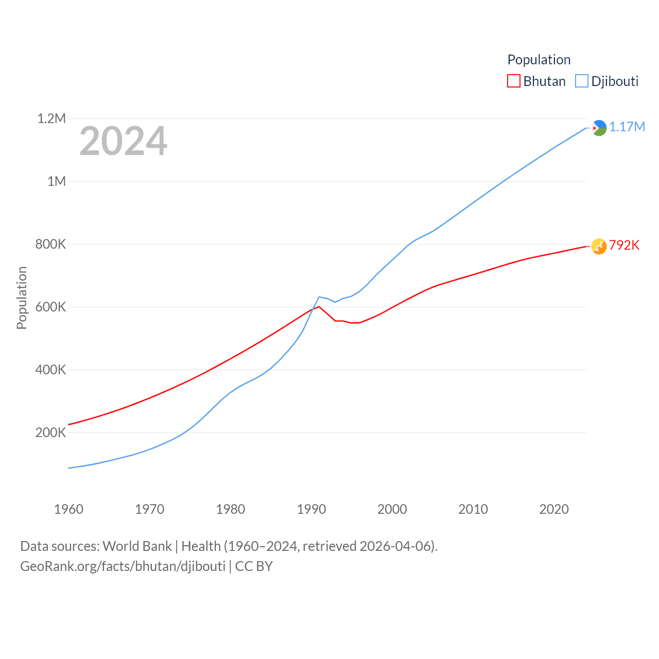 Bhutan has a population of 792K (ranked 163/197), compared with 1.17M in Djibouti (ranked 158/197). Bhutan's land area is 14,726 sq mi versus 8,950 sq mi for Djibouti (ranked 132nd vs. 147th).
