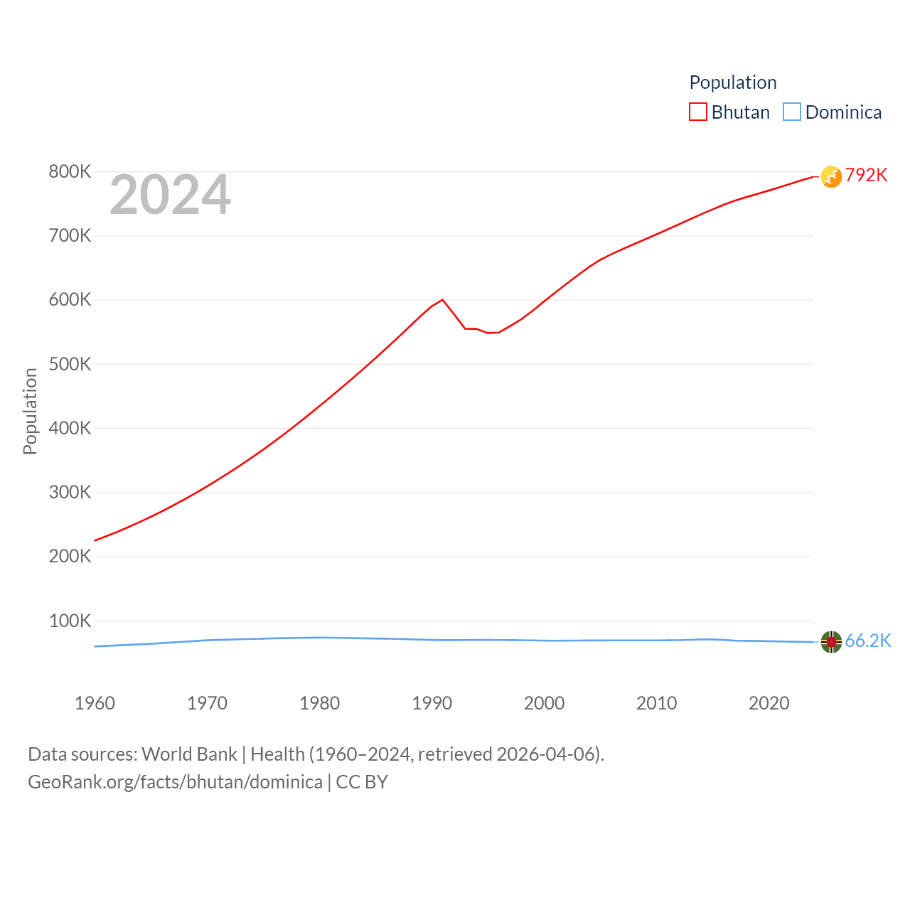 Bhutan has a population of 792K (ranked 163/197), compared with 66.2K in Dominica (ranked 188/197). Bhutan's land area is 14,726 sq mi versus 289.6 sq mi for Dominica (ranked 132nd vs. 175th).