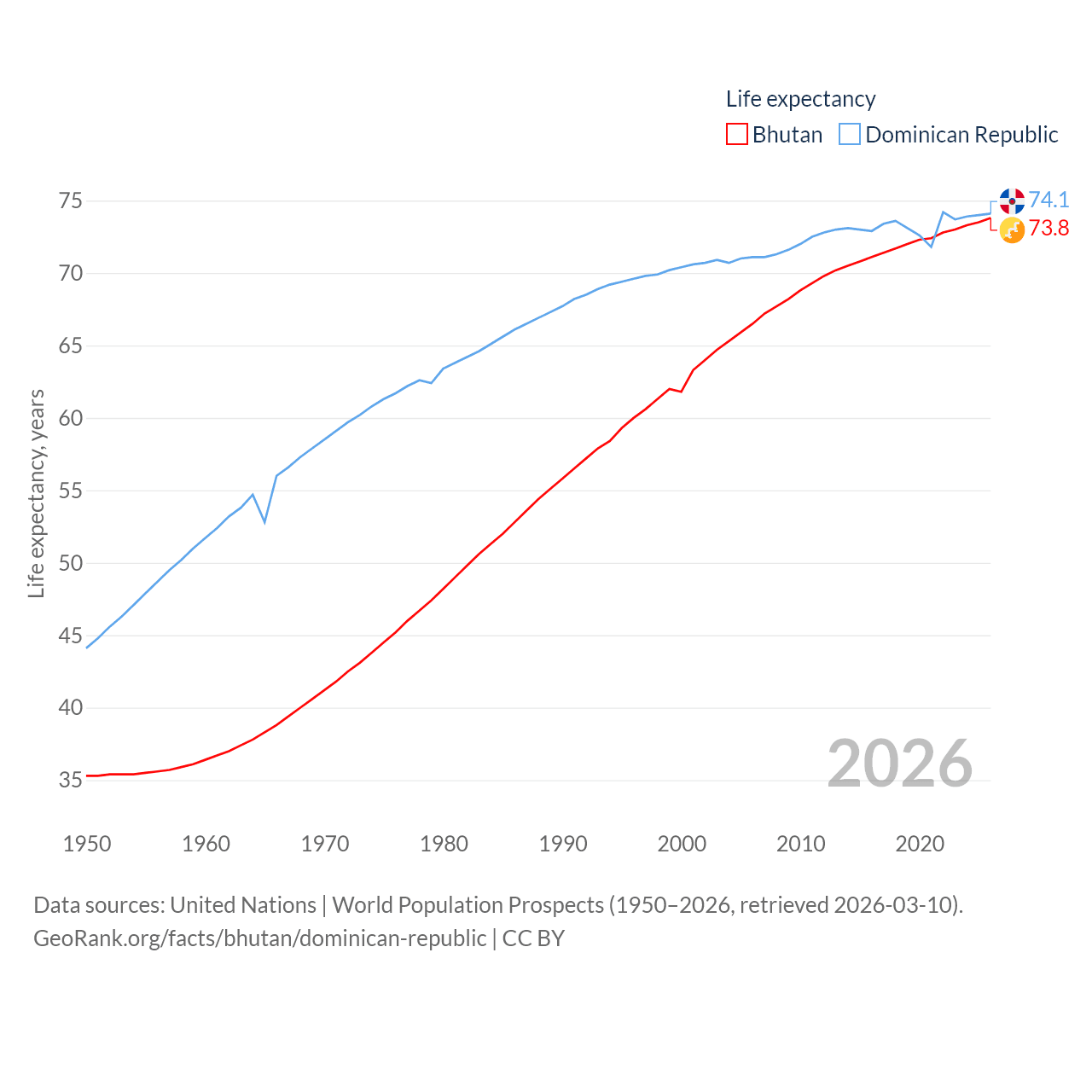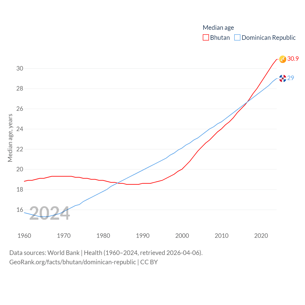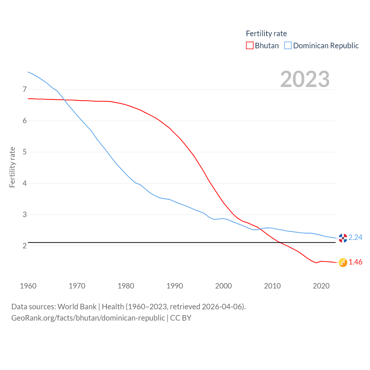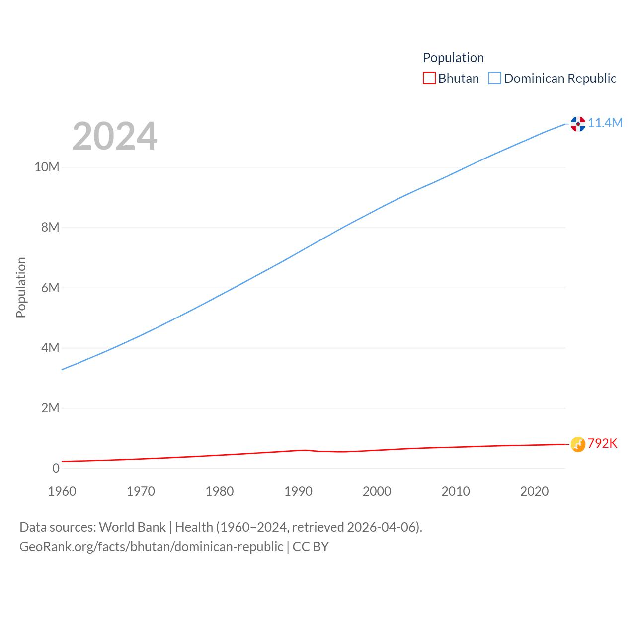 Bhutan has a population of 792K (ranked 163/197), compared with 11.4M in The Dominican Republic (ranked 85/197). Bhutan's land area is 14,726 sq mi versus 18,609 sq mi for The Dominican Republic (ranked 132nd vs. 127th).