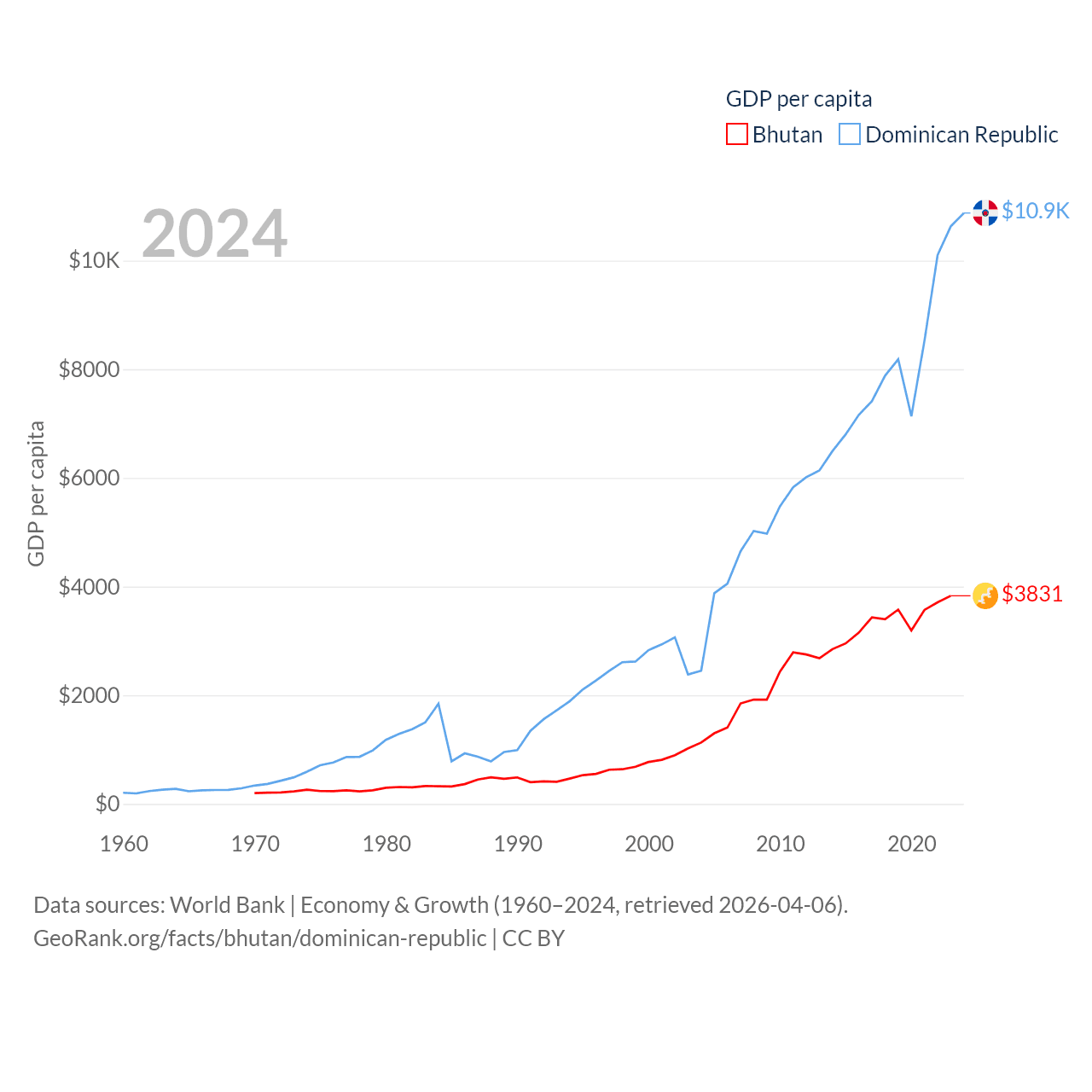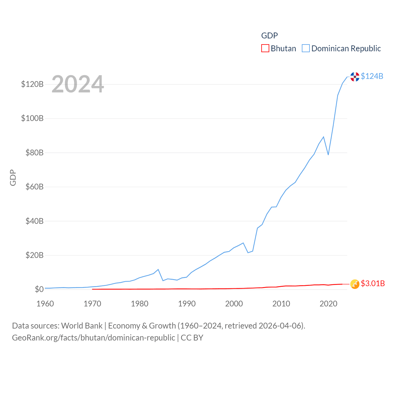 By GDP, Bhutan ranks 170/197 ($3.01B) and The Dominican Republic ranks 63/197 ($124B). By GDP per capita, Bhutan ranks 132/197 ($3,831), while The Dominican Republic ranks 83/197 ($10,876).