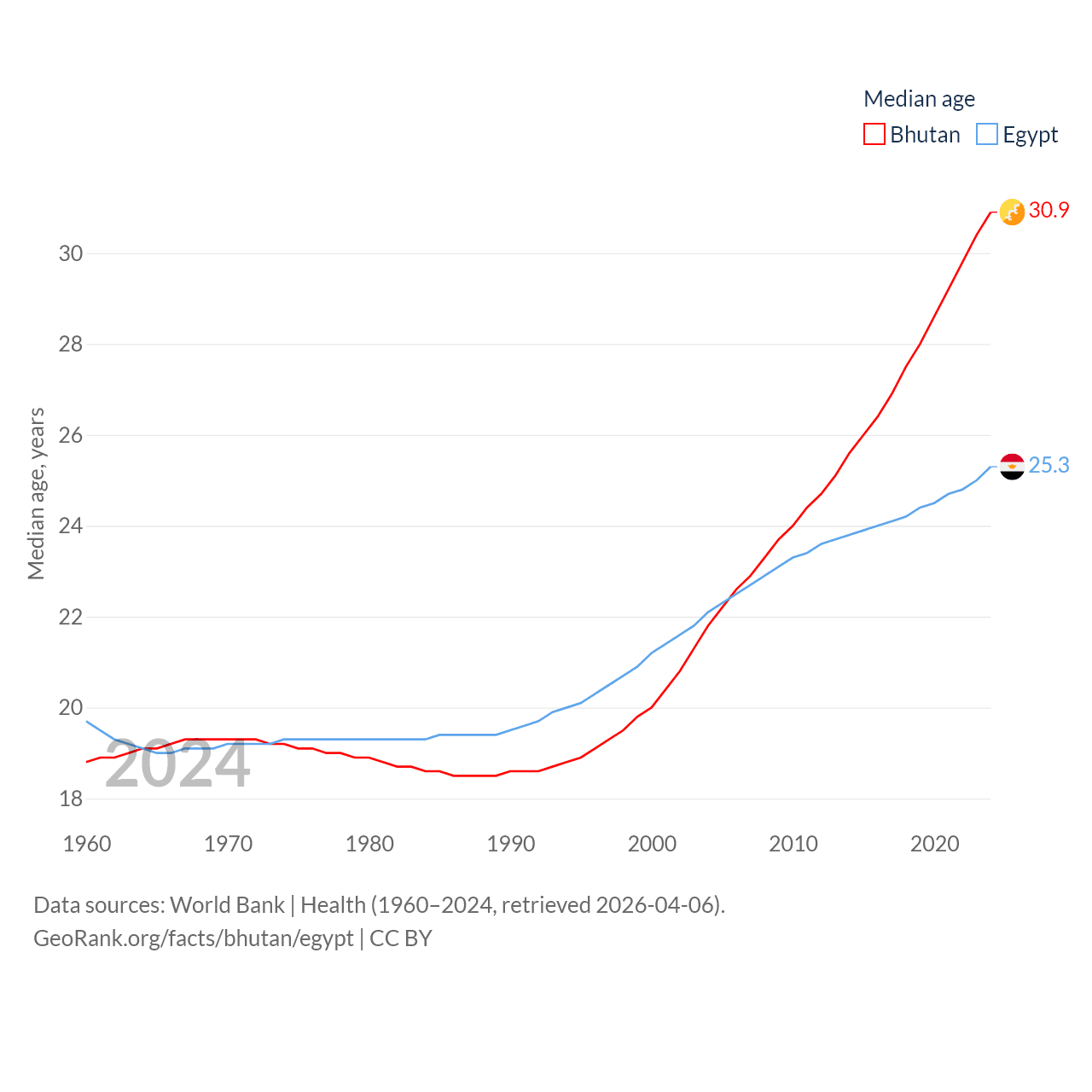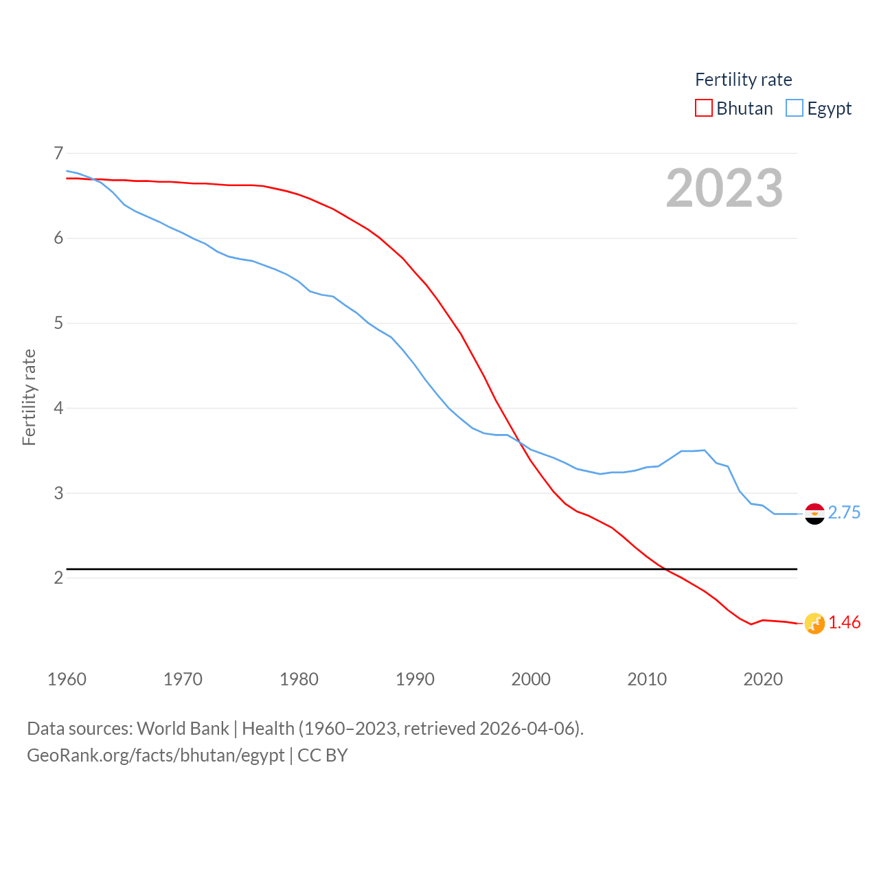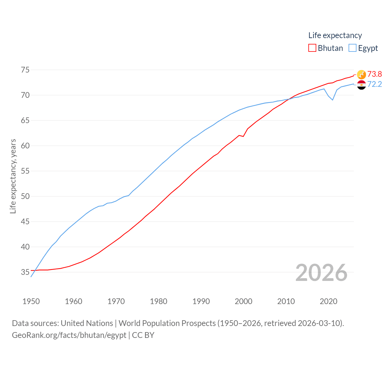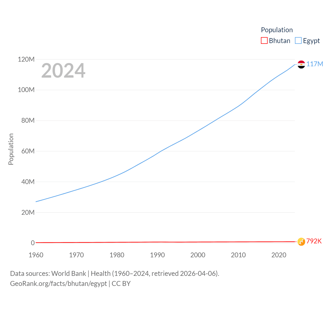 Bhutan has a population of 792K (ranked 163/197), compared with 117M in Egypt (ranked 13/197). Bhutan's land area is 14,726 sq mi versus 384,345 sq mi for Egypt (ranked 132nd vs. 29th).