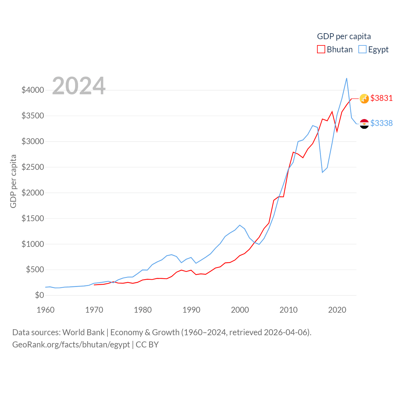 By GDP, Bhutan ranks 170/197 ($3.01B) and Egypt ranks 41/197 ($389B). By GDP per capita, Bhutan ranks 132/197 ($3,831), while Egypt ranks 138/197 ($3,338).