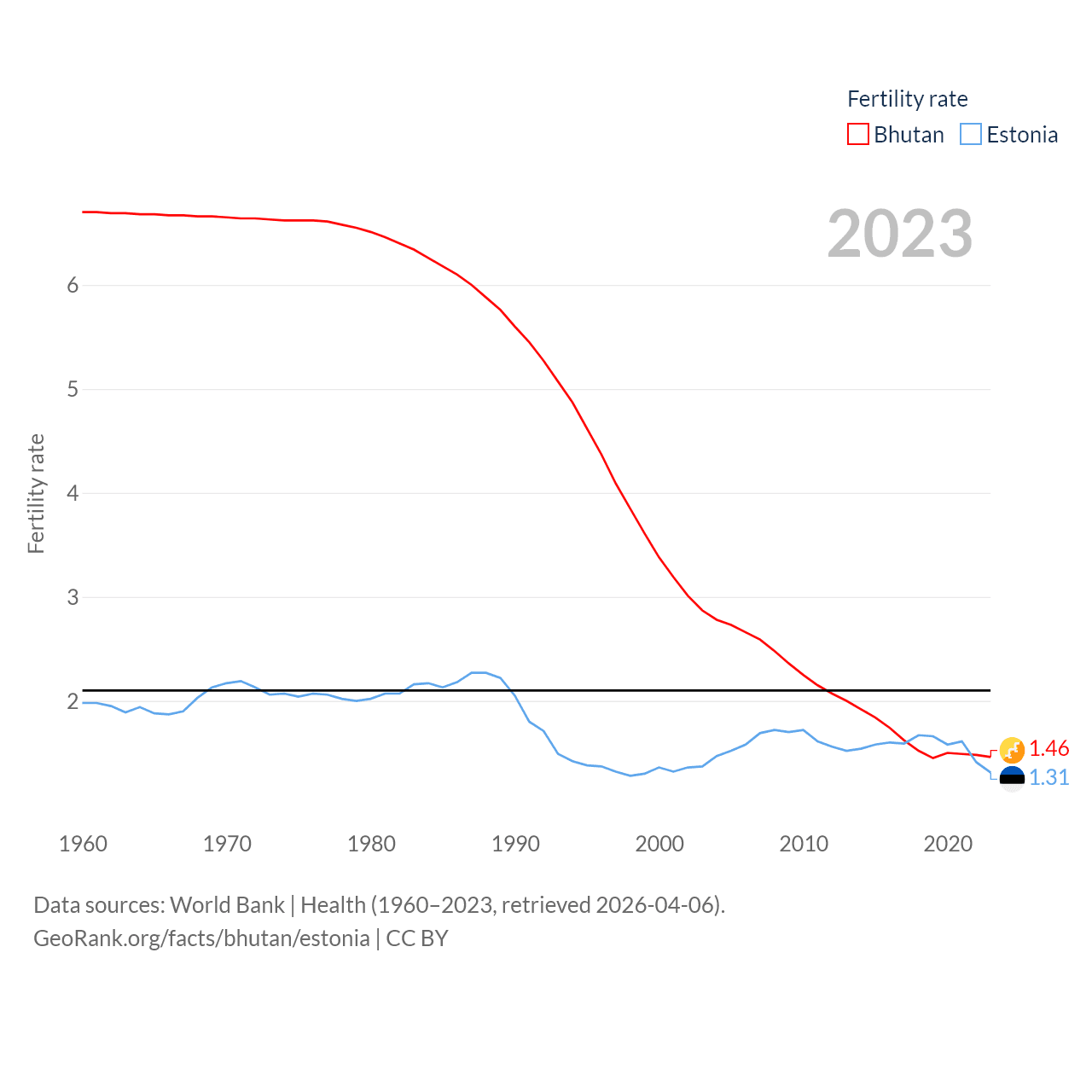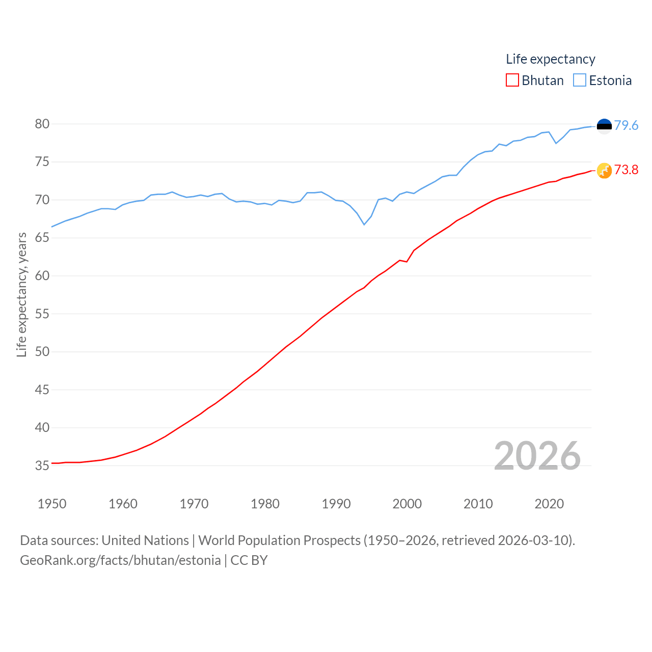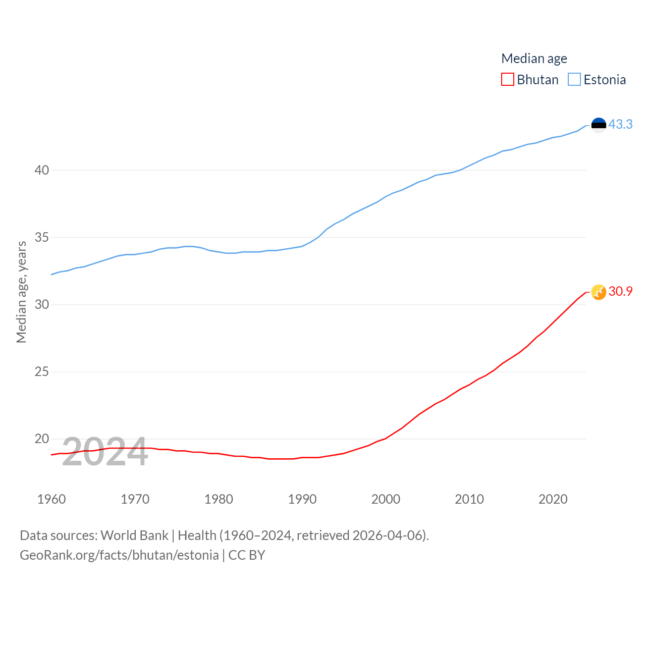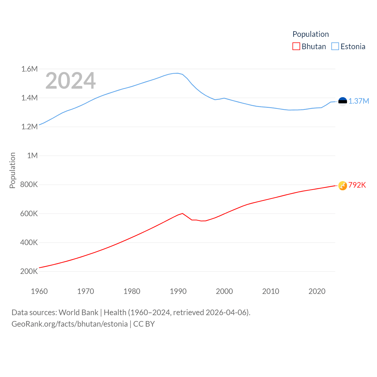 Bhutan has a population of 792K (ranked 163/197), compared with 1.37M in Estonia (ranked 153/197). Bhutan's land area is 14,726 sq mi versus 16,498 sq mi for Estonia (ranked 132nd vs. 129th).