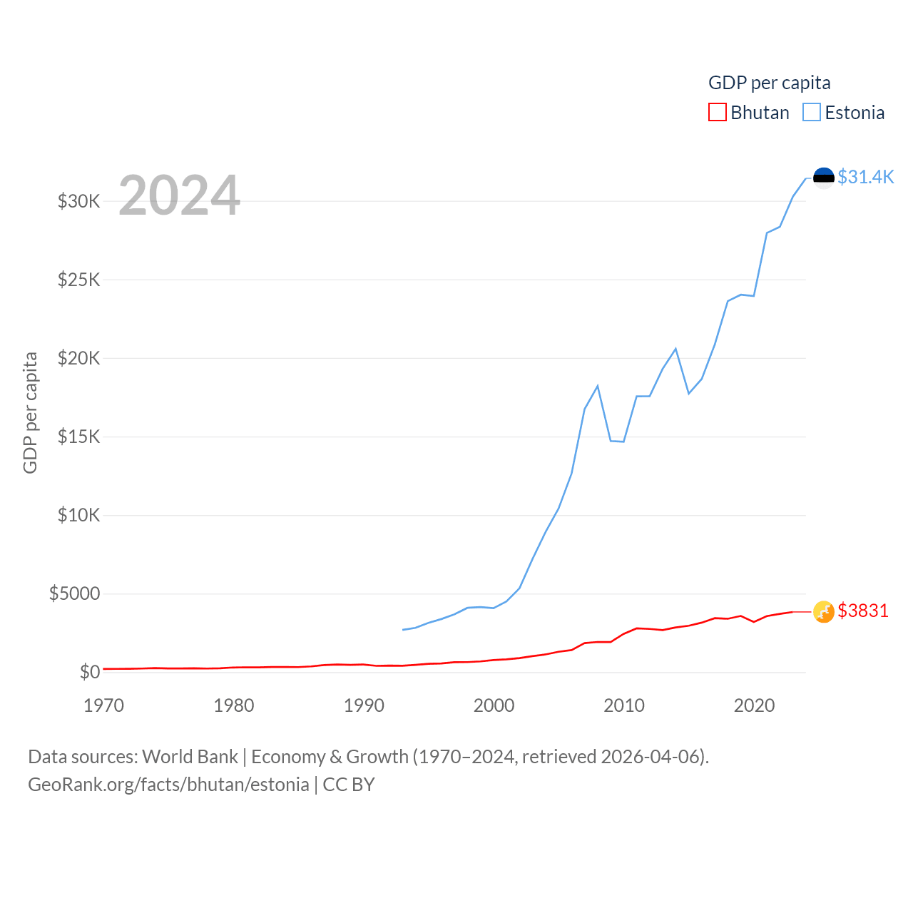 By GDP, Bhutan ranks 170/197 ($3.01B) and Estonia ranks 100/197 ($43.1B). By GDP per capita, Bhutan ranks 132/197 ($3,831), while Estonia ranks 40/197 ($31,428).