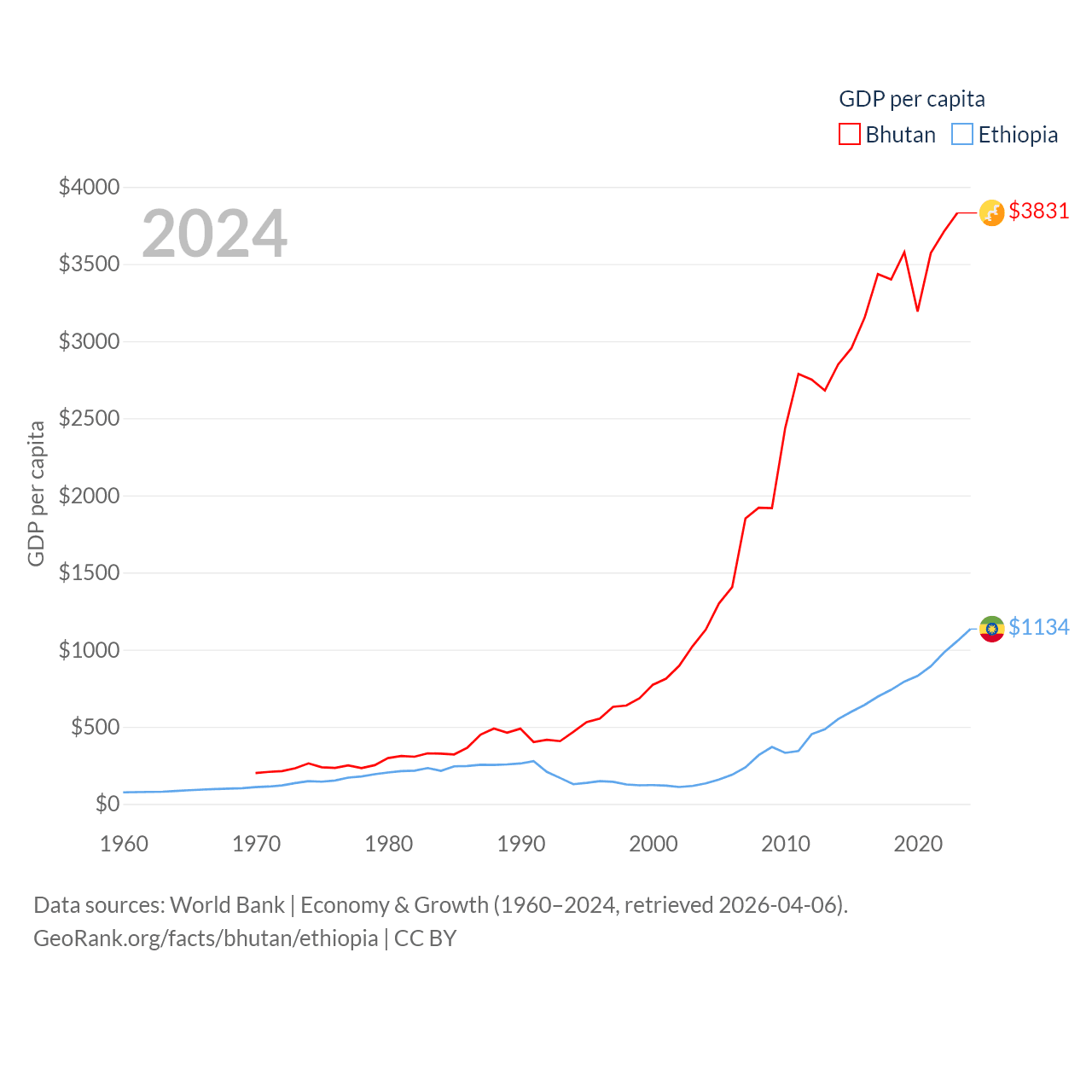 By GDP, Bhutan ranks 170/197 ($3.01B) and Ethiopia ranks 60/197 ($150B). By GDP per capita, Bhutan ranks 132/197 ($3,831), while Ethiopia ranks 171/197 ($1,134).