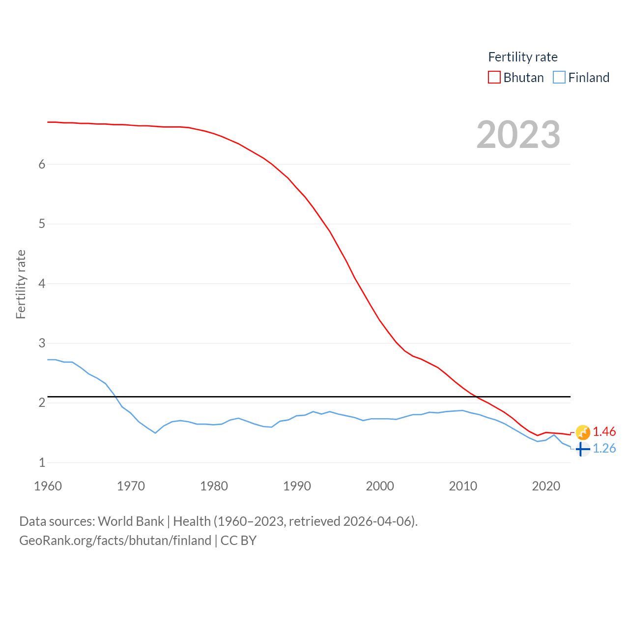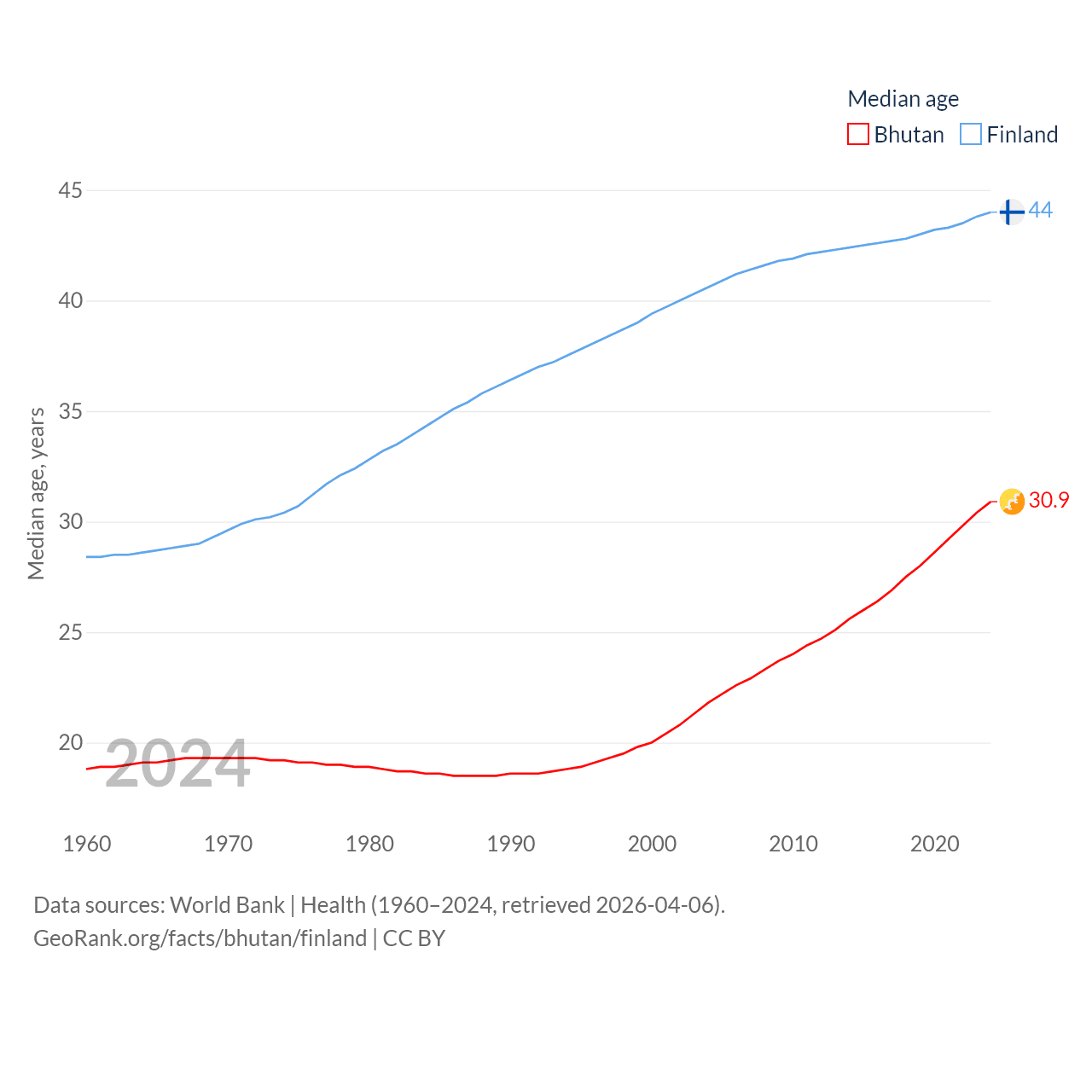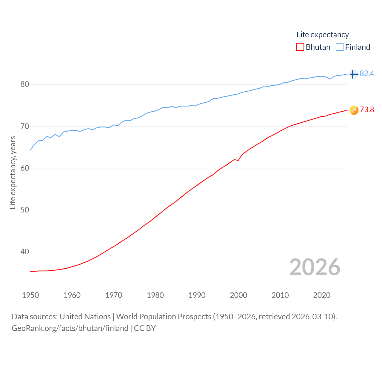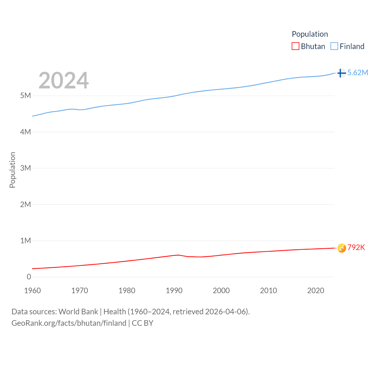 Bhutan has a population of 792K (ranked 163/197), compared with 5.62M in Finland (ranked 116/197). Bhutan's land area is 14,726 sq mi versus 117,360 sq mi for Finland (ranked 132nd vs. 70th).