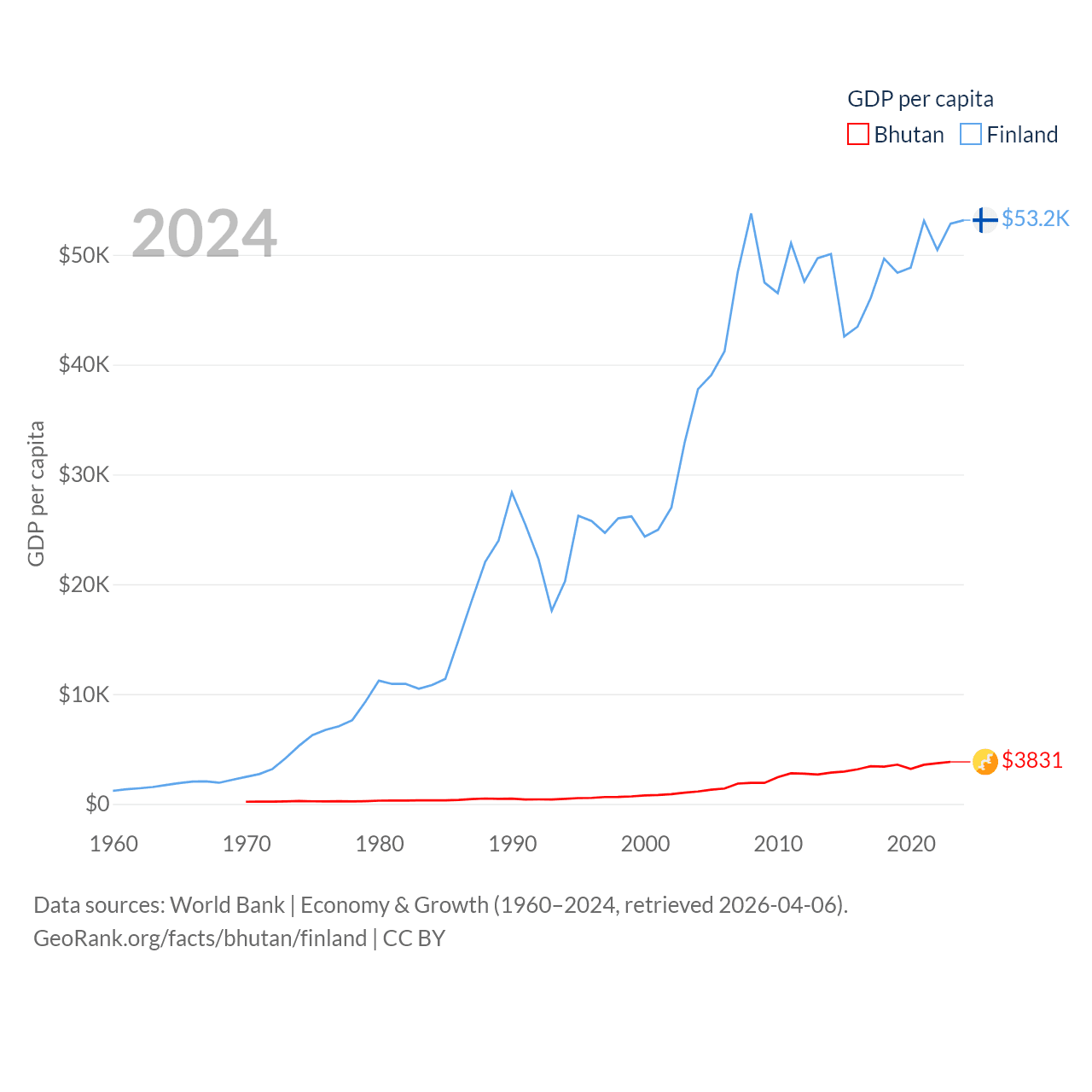 By GDP, Bhutan ranks 170/197 ($3.01B) and Finland ranks 47/197 ($299B). By GDP per capita, Bhutan ranks 132/197 ($3,831), while Finland ranks 23/197 ($53,150).