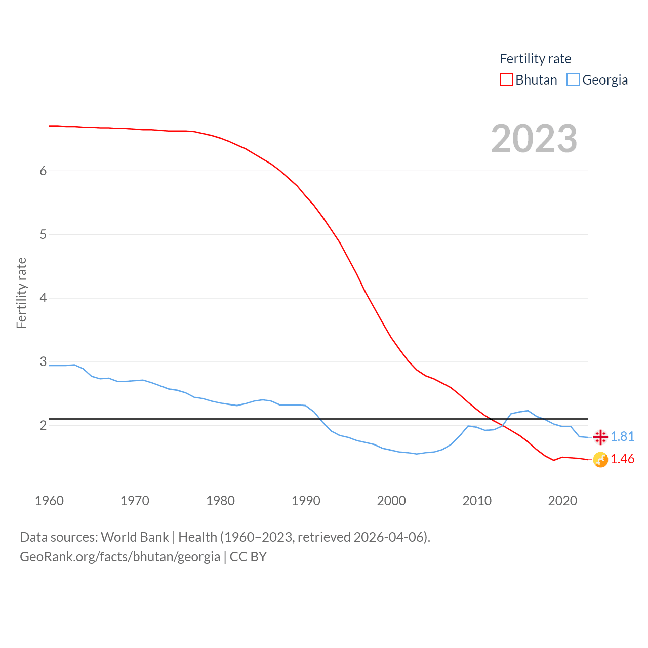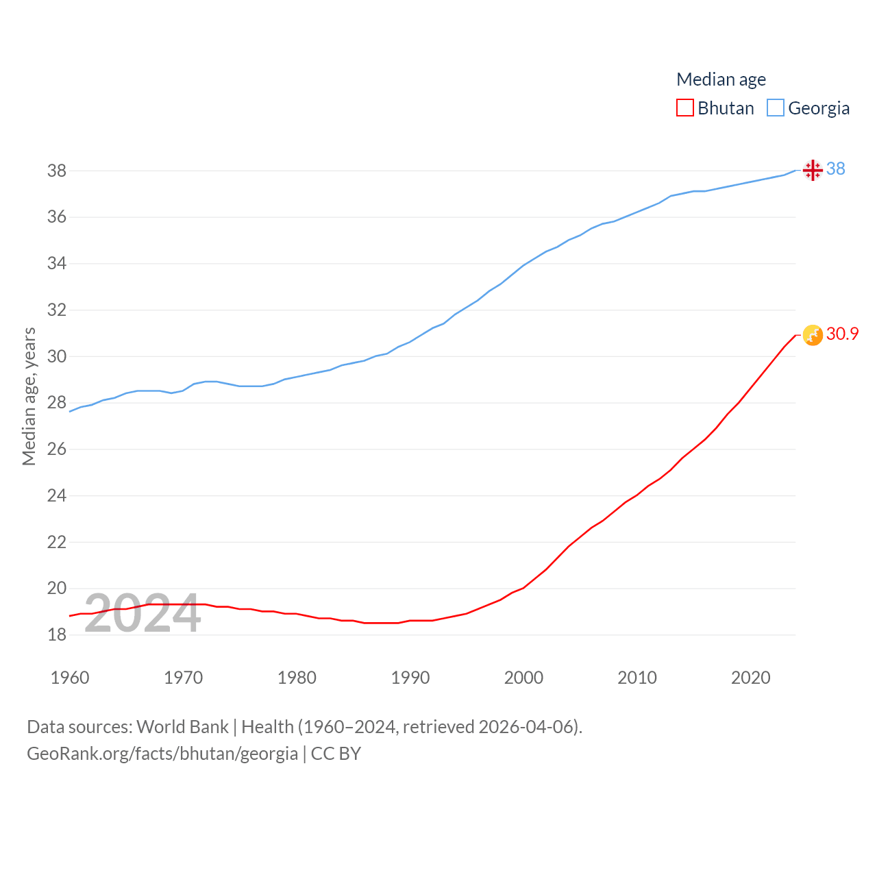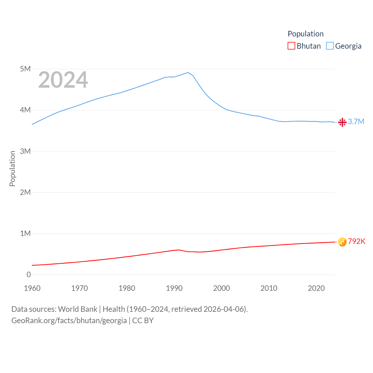 Bhutan has a population of 792K (ranked 163/197), compared with 3.7M in Georgia (ranked 130/197). Bhutan's land area is 14,726 sq mi versus 26,830 sq mi for Georgia (ranked 132nd vs. 118th).