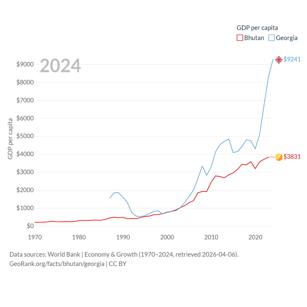 By GDP, Bhutan ranks 170/197 ($3.01B) and Georgia ranks 107/197 ($34.2B). By GDP per capita, Bhutan ranks 132/197 ($3,831), while Georgia ranks 89/197 ($9,241).