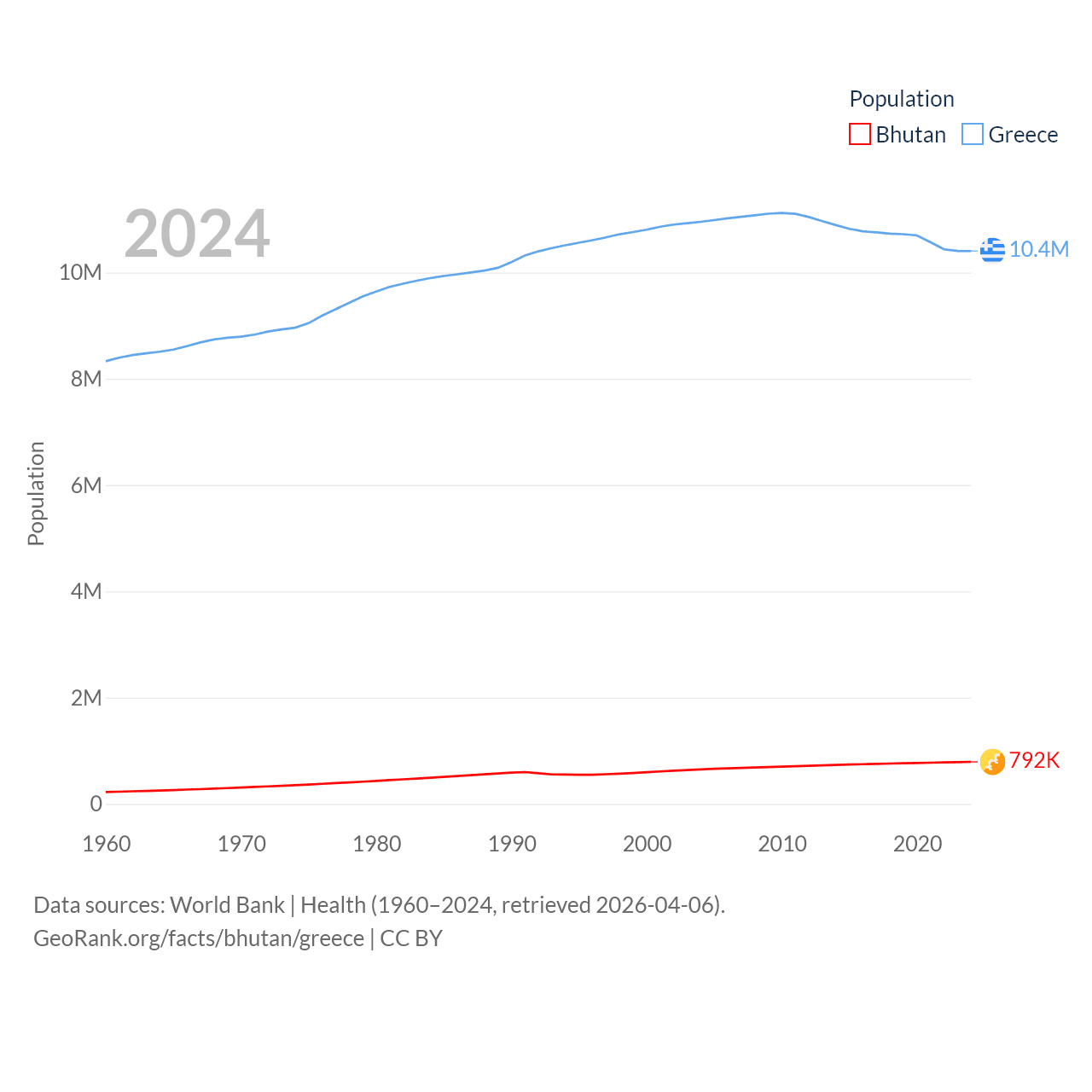 Bhutan has a population of 792K (ranked 163/197), compared with 10.4M in Greece (ranked 94/197). Bhutan's land area is 14,726 sq mi versus 49,769 sq mi for Greece (ranked 132nd vs. 95th).