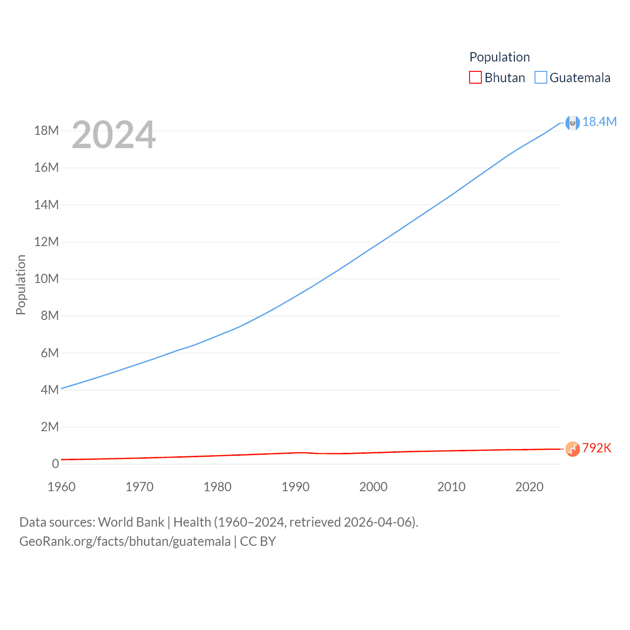 Bhutan has a population of 792K (ranked 163/197), compared with 18.4M in Guatemala (ranked 70/197). Bhutan's land area is 14,726 sq mi versus 41,375 sq mi for Guatemala (ranked 132nd vs. 102nd).