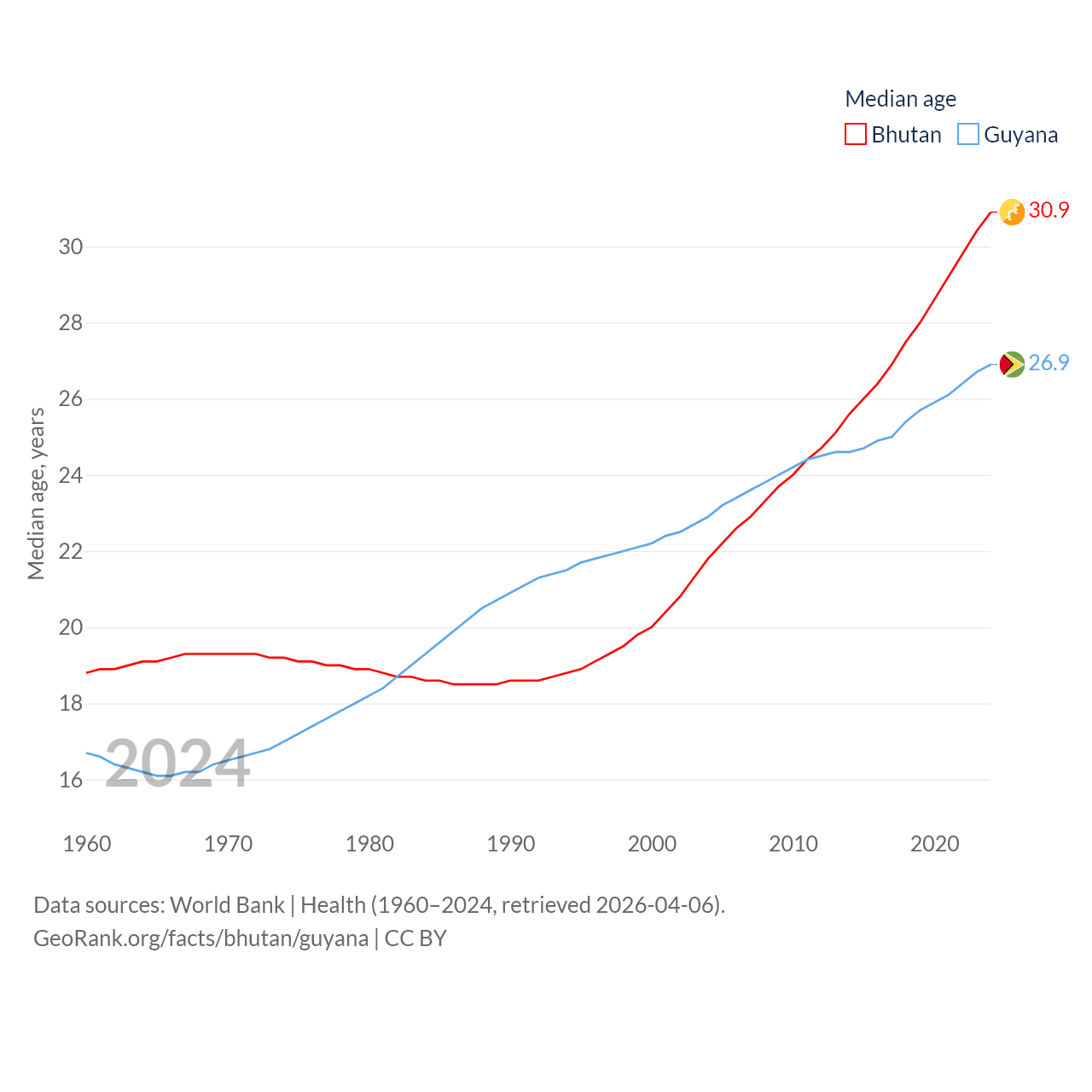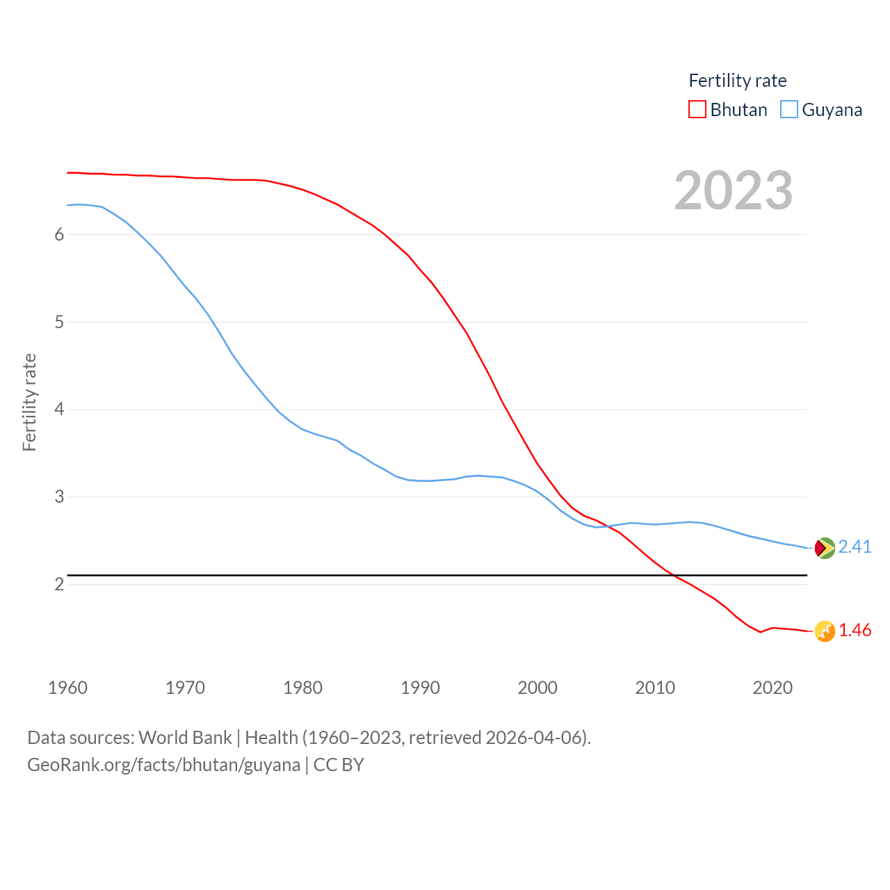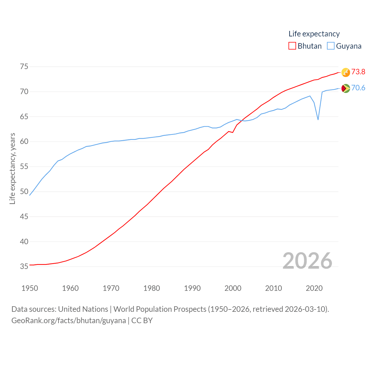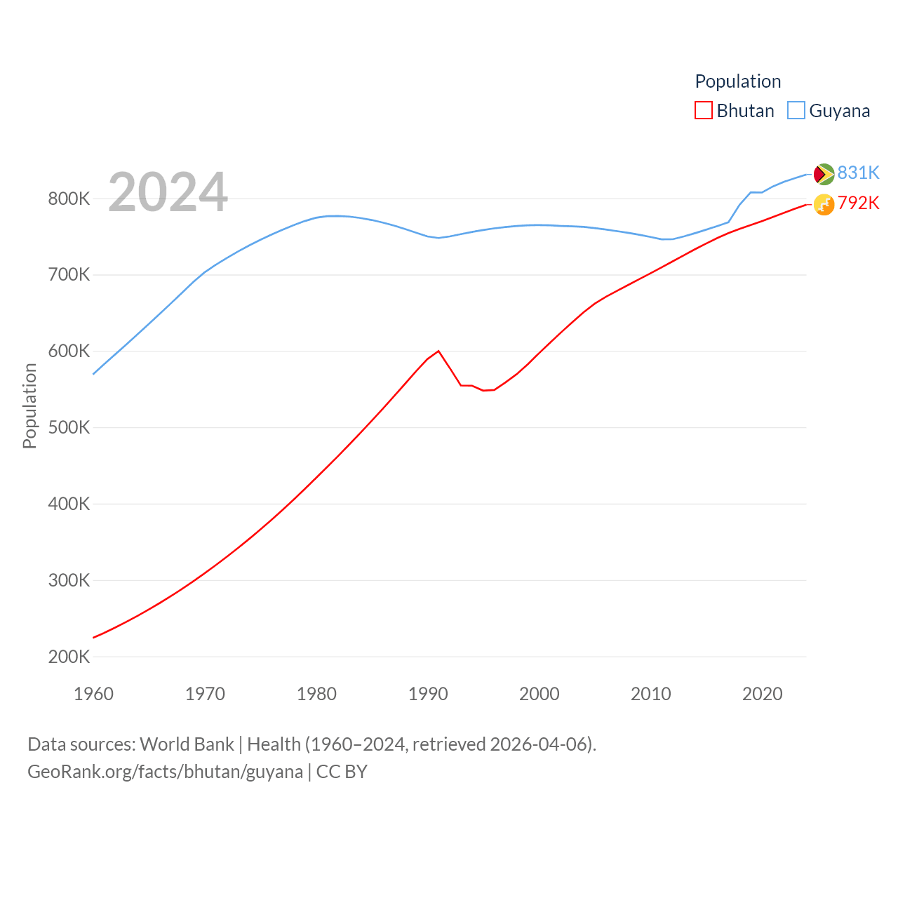Bhutan has a population of 792K (ranked 163/197), compared with 831K in Guyana (ranked 161/197). Bhutan's land area is 14,726 sq mi versus 81,522 sq mi for Guyana (ranked 132nd vs. 82nd).