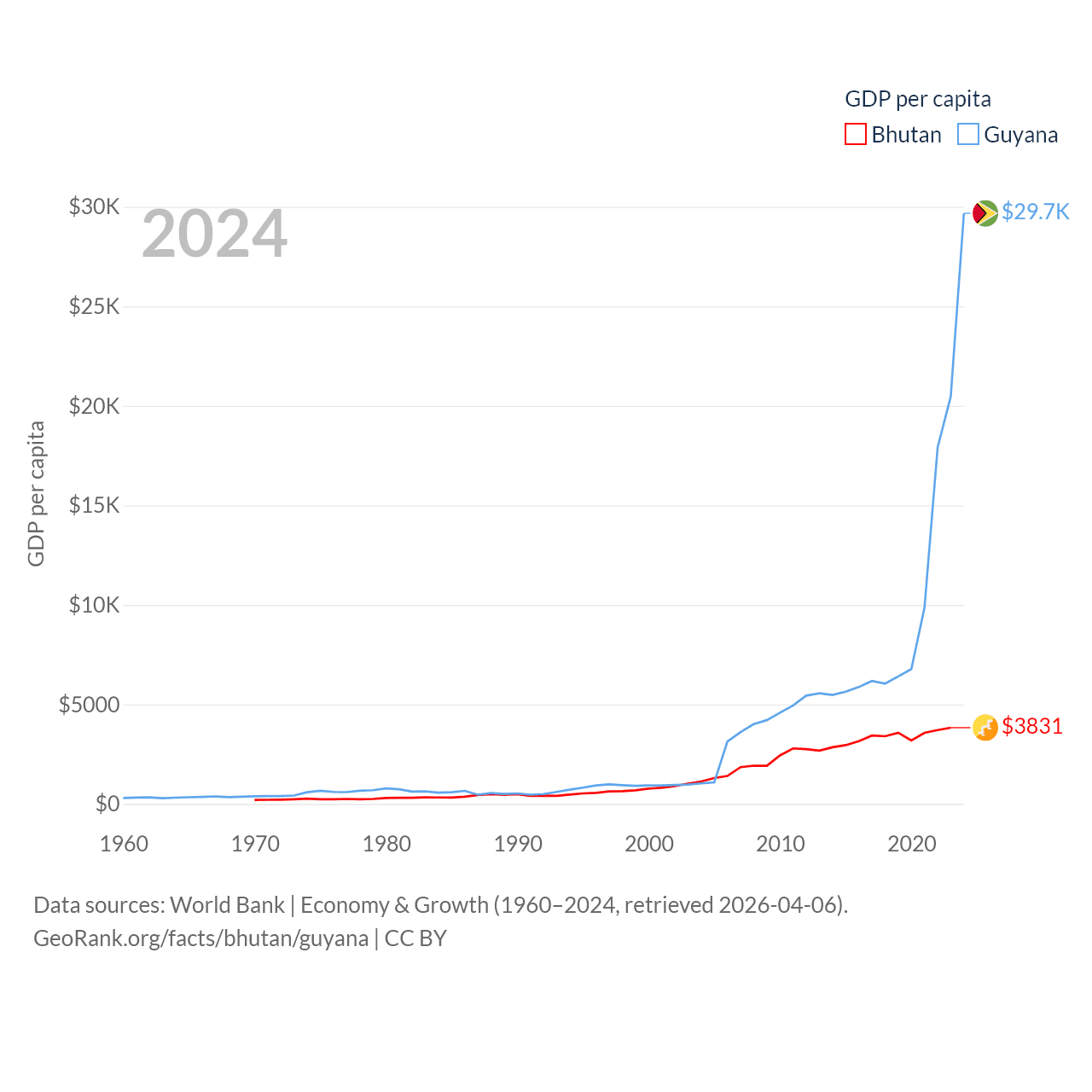 By GDP, Bhutan ranks 170/197 ($3.01B) and Guyana ranks 120/197 ($24.7B). By GDP per capita, Bhutan ranks 132/197 ($3,831), while Guyana ranks 41/197 ($29,675).