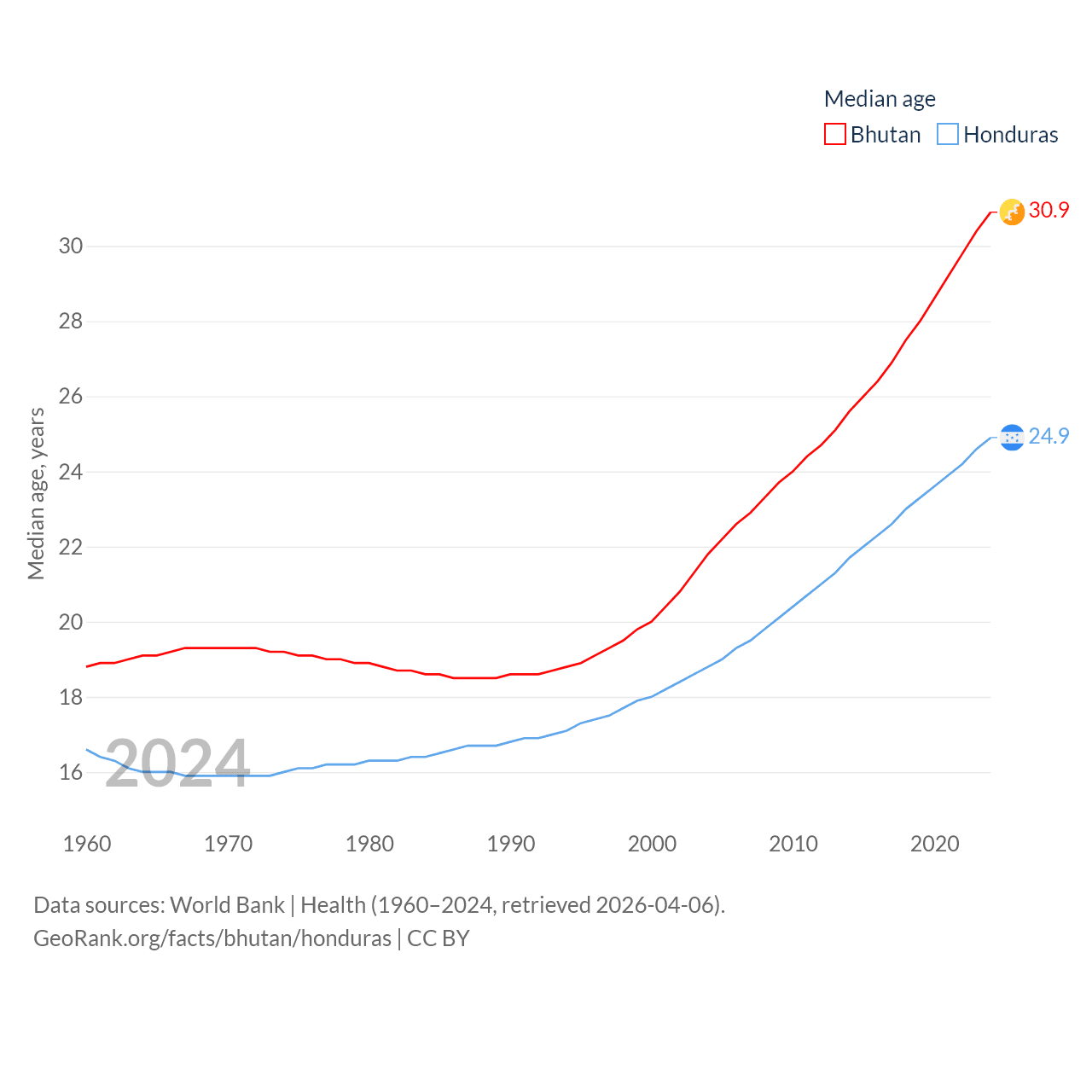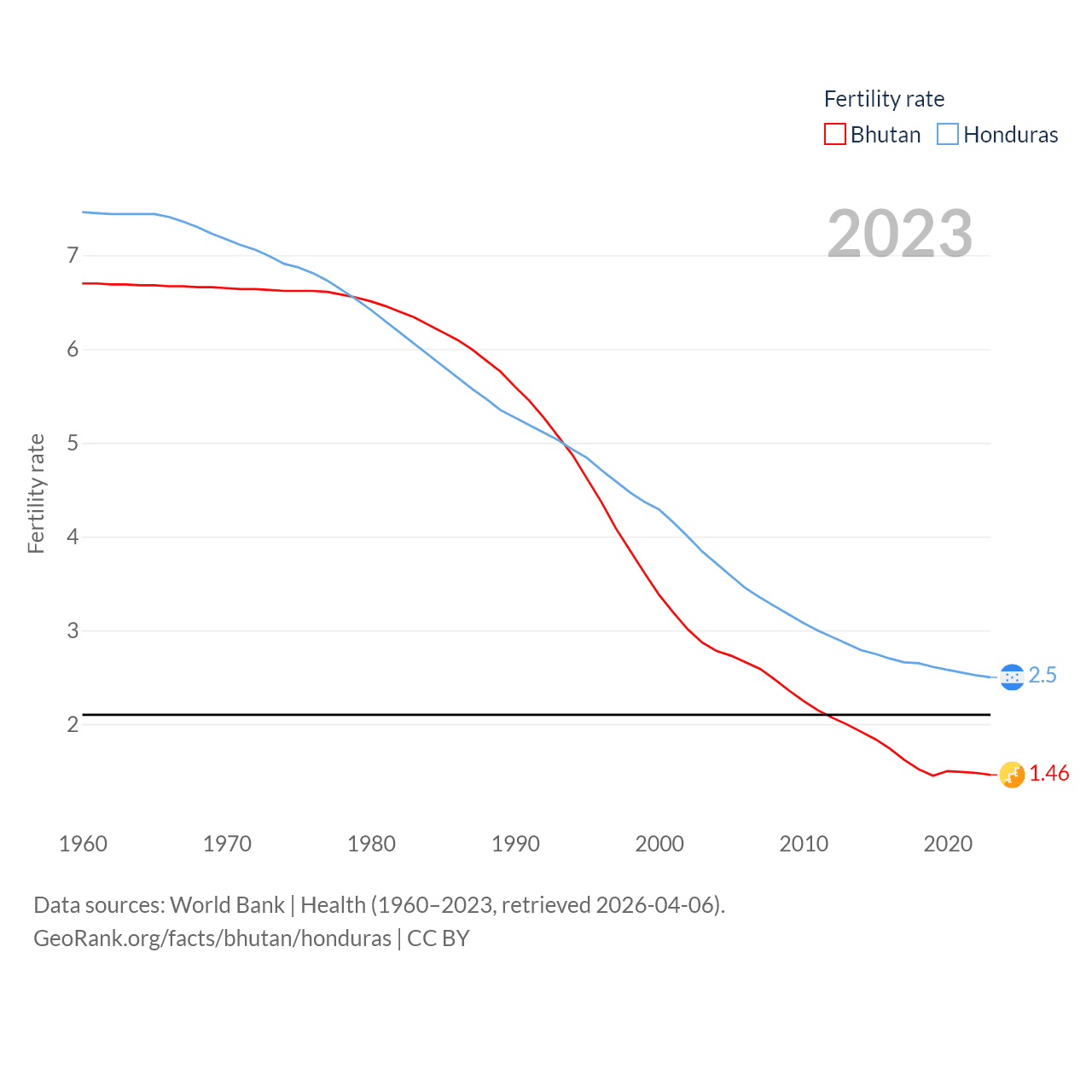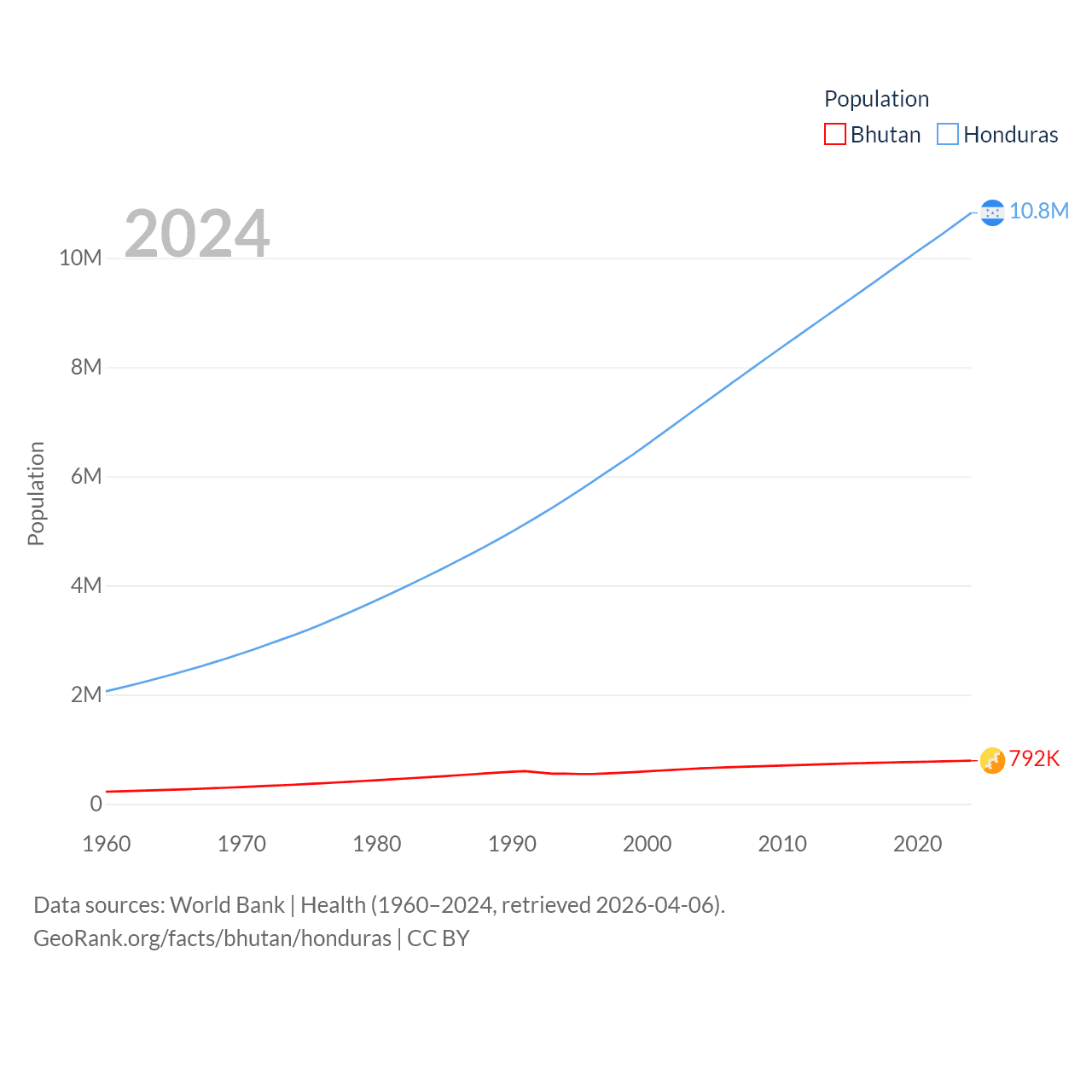 Bhutan has a population of 792K (ranked 163/197), compared with 10.8M in Honduras (ranked 89/197). Bhutan's land area is 14,726 sq mi versus 43,201 sq mi for Honduras (ranked 132nd vs. 100th).