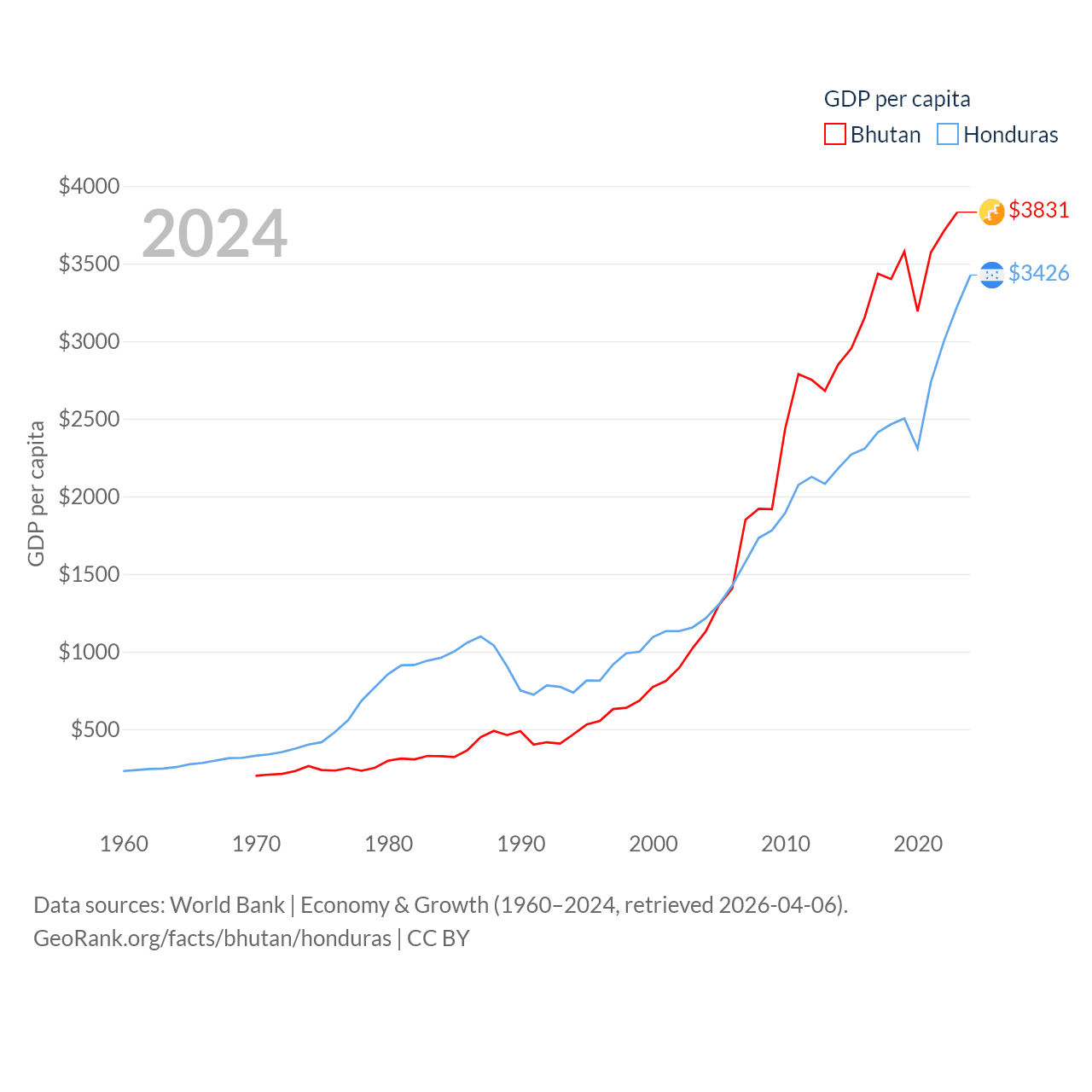 By GDP, Bhutan ranks 170/197 ($3.01B) and Honduras ranks 104/197 ($37.1B). By GDP per capita, Bhutan ranks 132/197 ($3,831), while Honduras ranks 136/197 ($3,426).