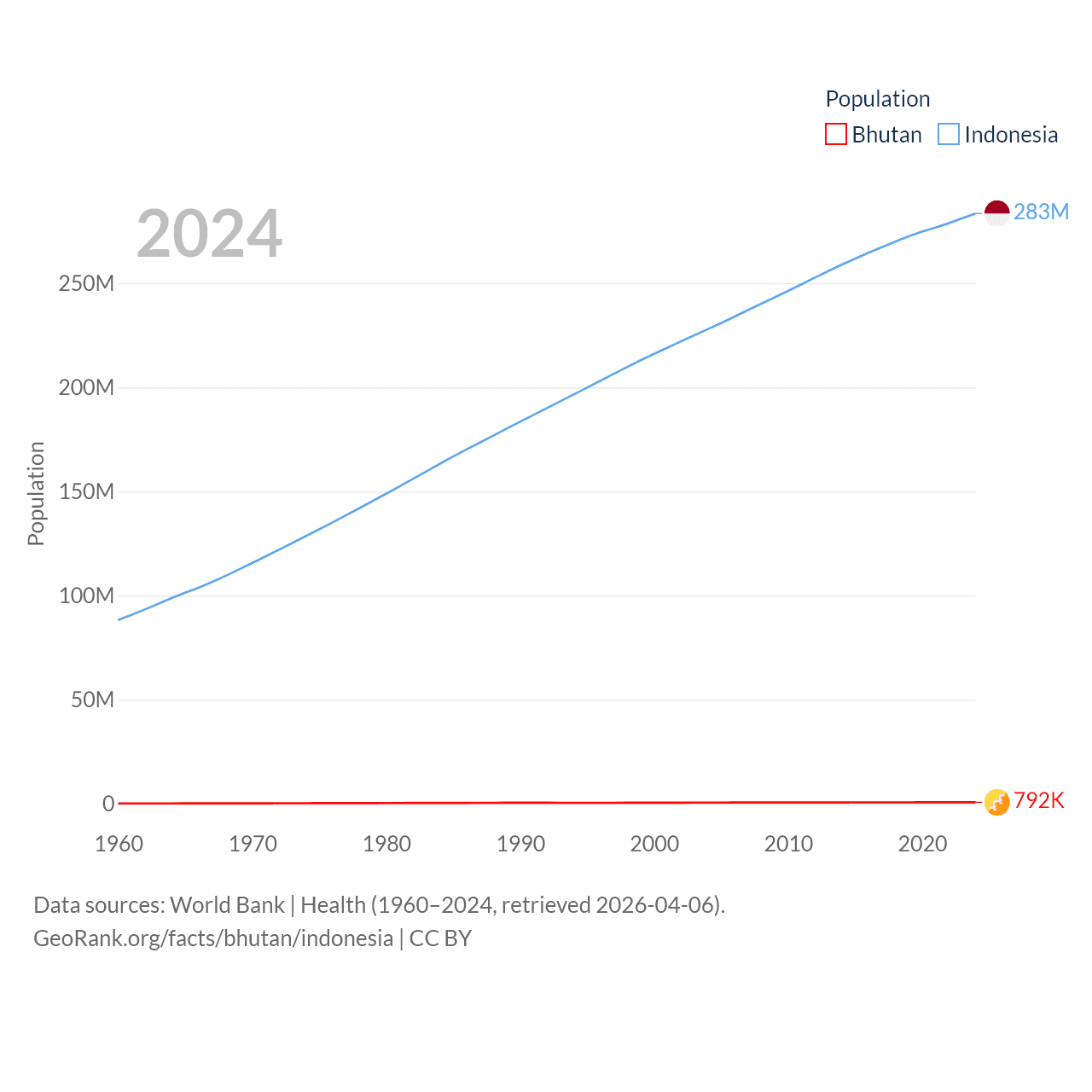 Bhutan has a population of 792K (ranked 163/197), compared with 283M in Indonesia (ranked 4/197). Bhutan's land area is 14,726 sq mi versus 730,720 sq mi for Indonesia (ranked 132nd vs. 14th).