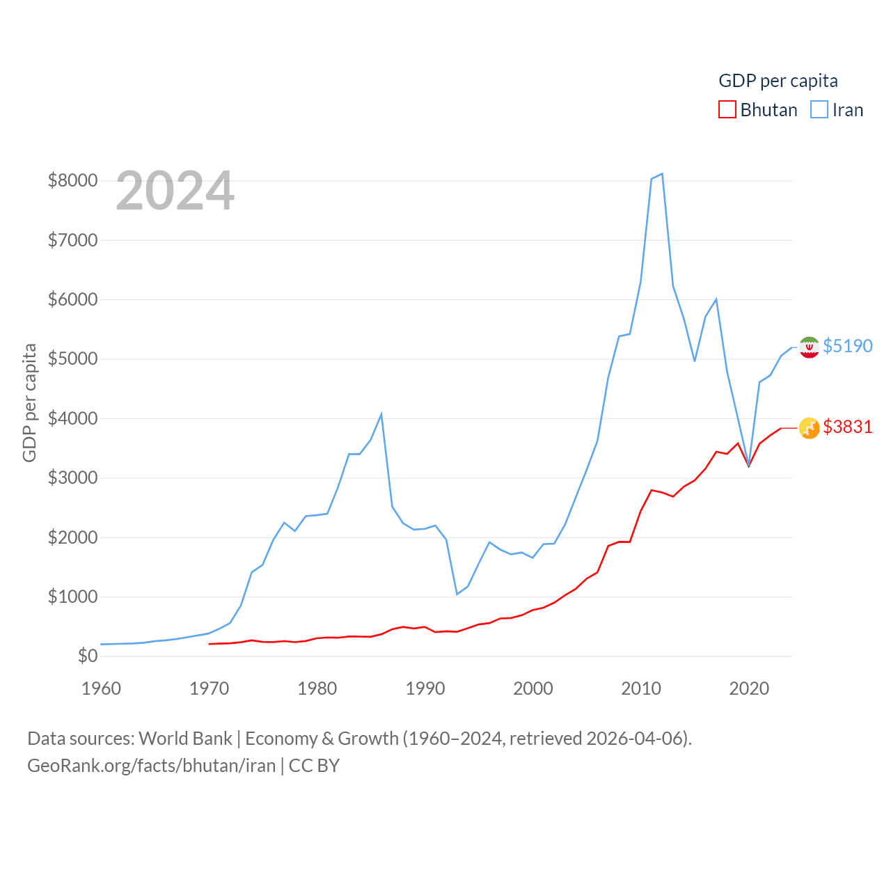 By GDP, Bhutan ranks 170/197 ($3.01B) and Iran ranks 34/197 ($475B). By GDP per capita, Bhutan ranks 132/197 ($3,831), while Iran ranks 119/197 ($5,190).
