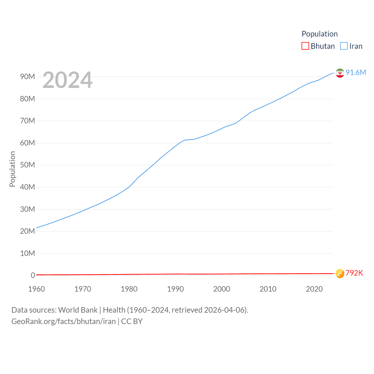 Bhutan has a population of 792K (ranked 163/197), compared with 91.6M in Iran (ranked 17/197). Bhutan's land area is 14,726 sq mi versus 626,451 sq mi for Iran (ranked 132nd vs. 17th).