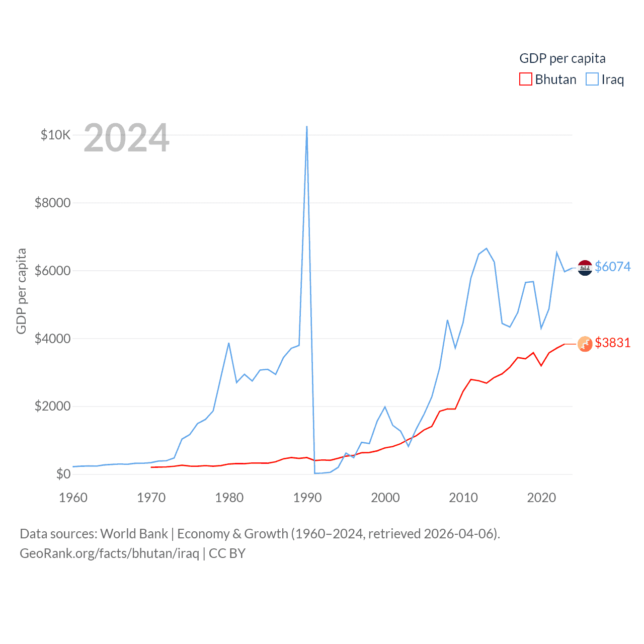 By GDP, Bhutan ranks 170/197 ($3.01B) and Iraq ranks 50/197 ($280B). By GDP per capita, Bhutan ranks 132/197 ($3,831), while Iraq ranks 113/197 ($6,074).