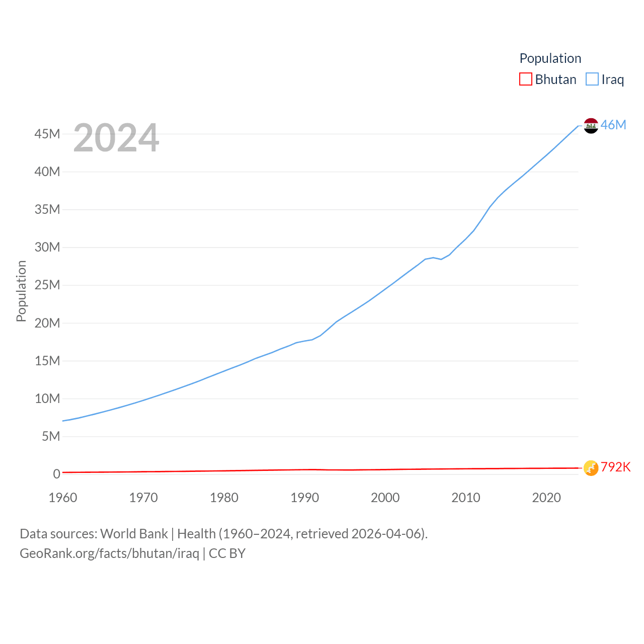 Bhutan has a population of 792K (ranked 163/197), compared with 46M in Iraq (ranked 34/197). Bhutan's land area is 14,726 sq mi versus 167,619 sq mi for Iraq (ranked 132nd vs. 57th).