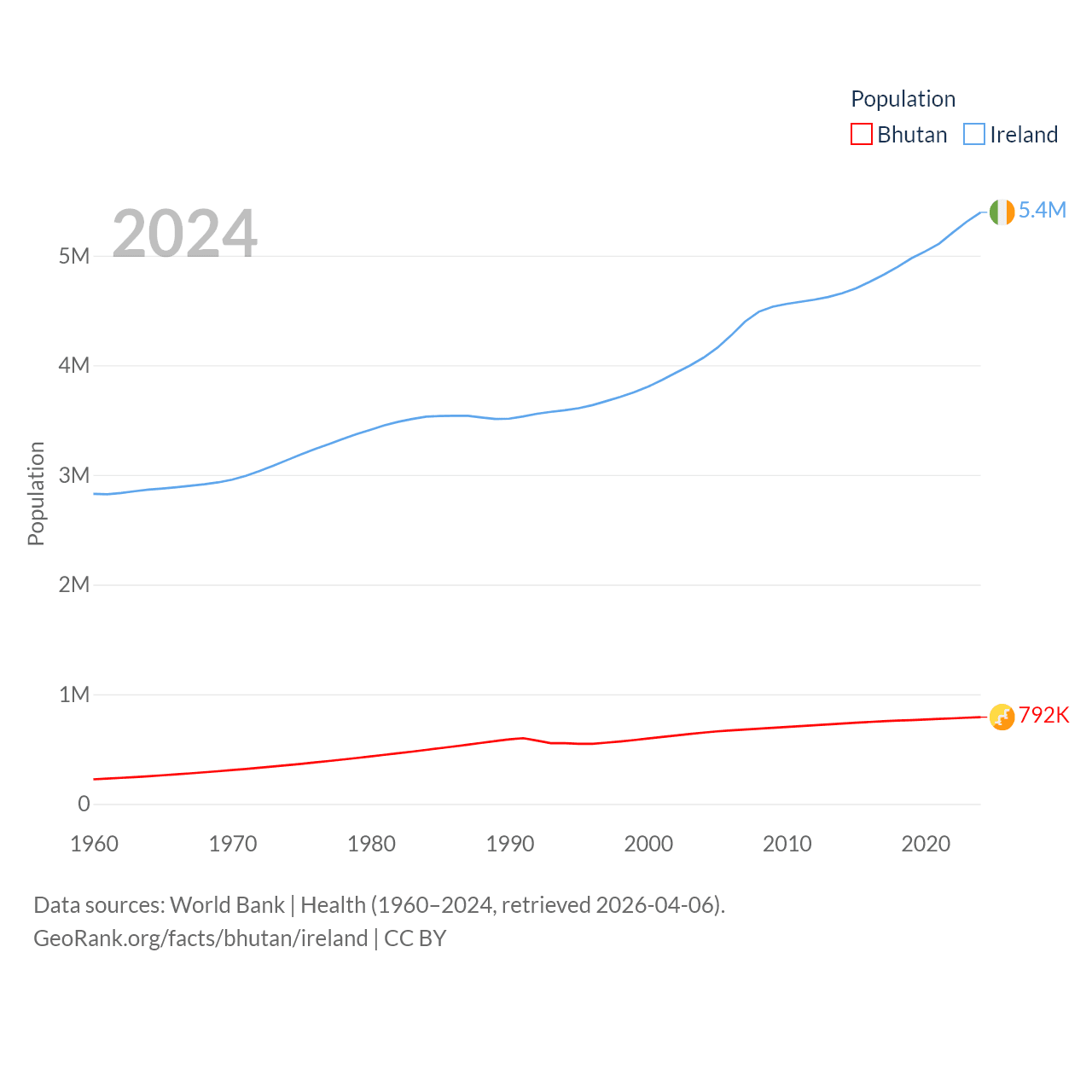 Bhutan has a population of 792K (ranked 163/197), compared with 5.4M in Ireland (ranked 120/197). Bhutan's land area is 14,726 sq mi versus 26,599 sq mi for Ireland (ranked 132nd vs. 119th).