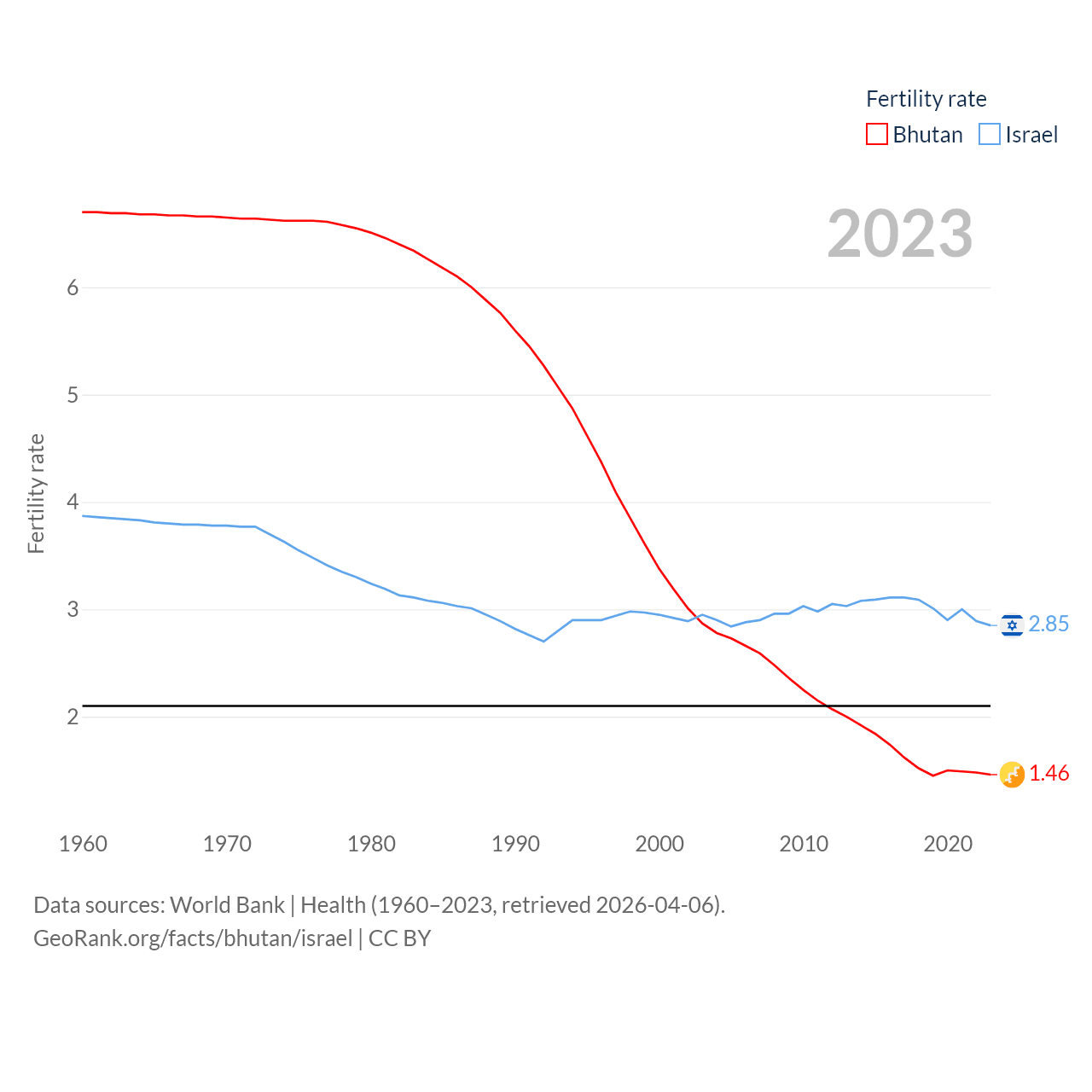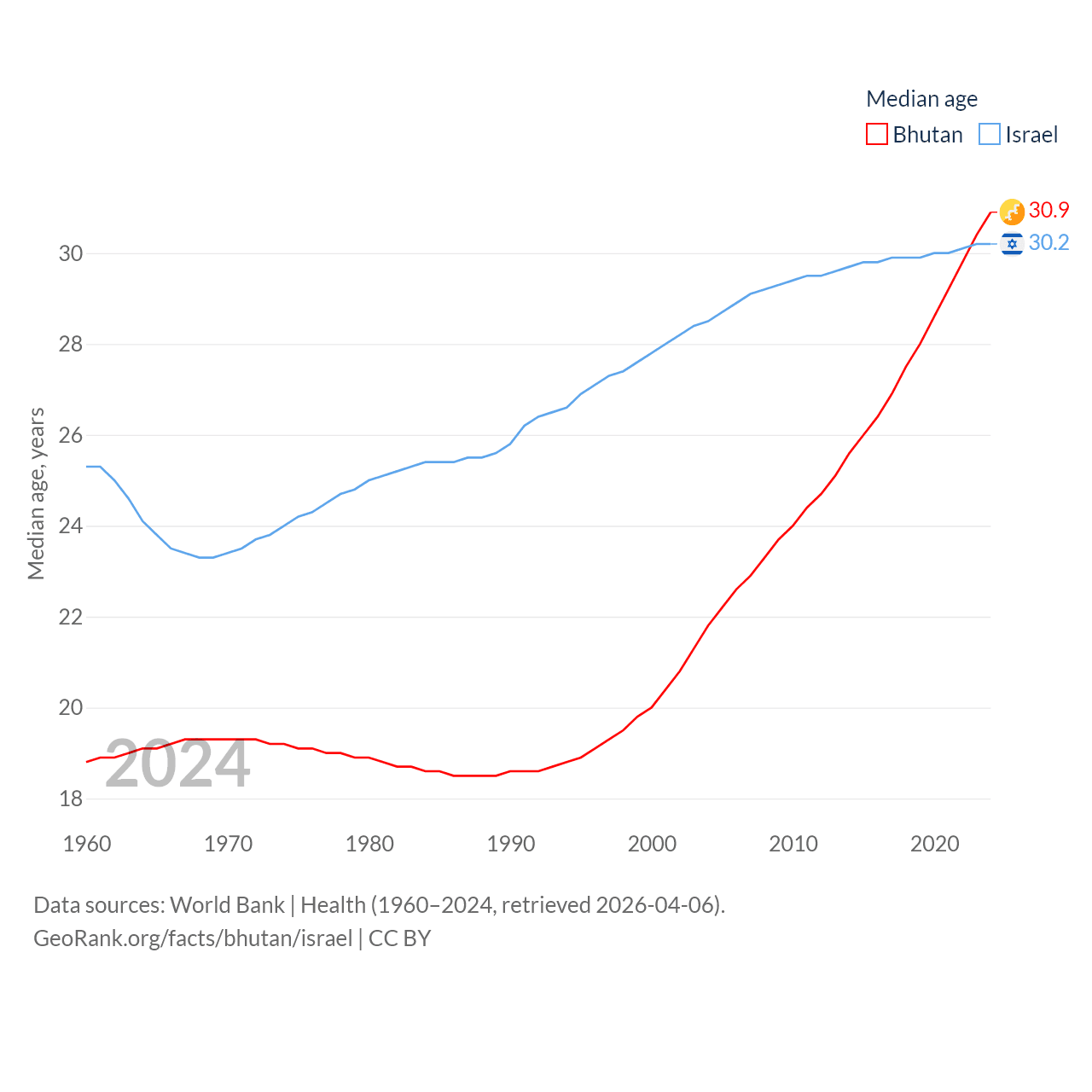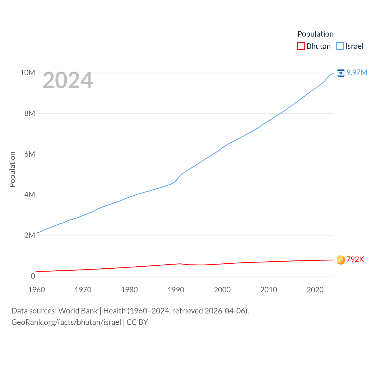 Bhutan has a population of 792K (ranked 163/197), compared with 9.97M in Israel (ranked 96/197). Bhutan's land area is 14,726 sq mi versus 8,355 sq mi for Israel (ranked 132nd vs. 149th).
