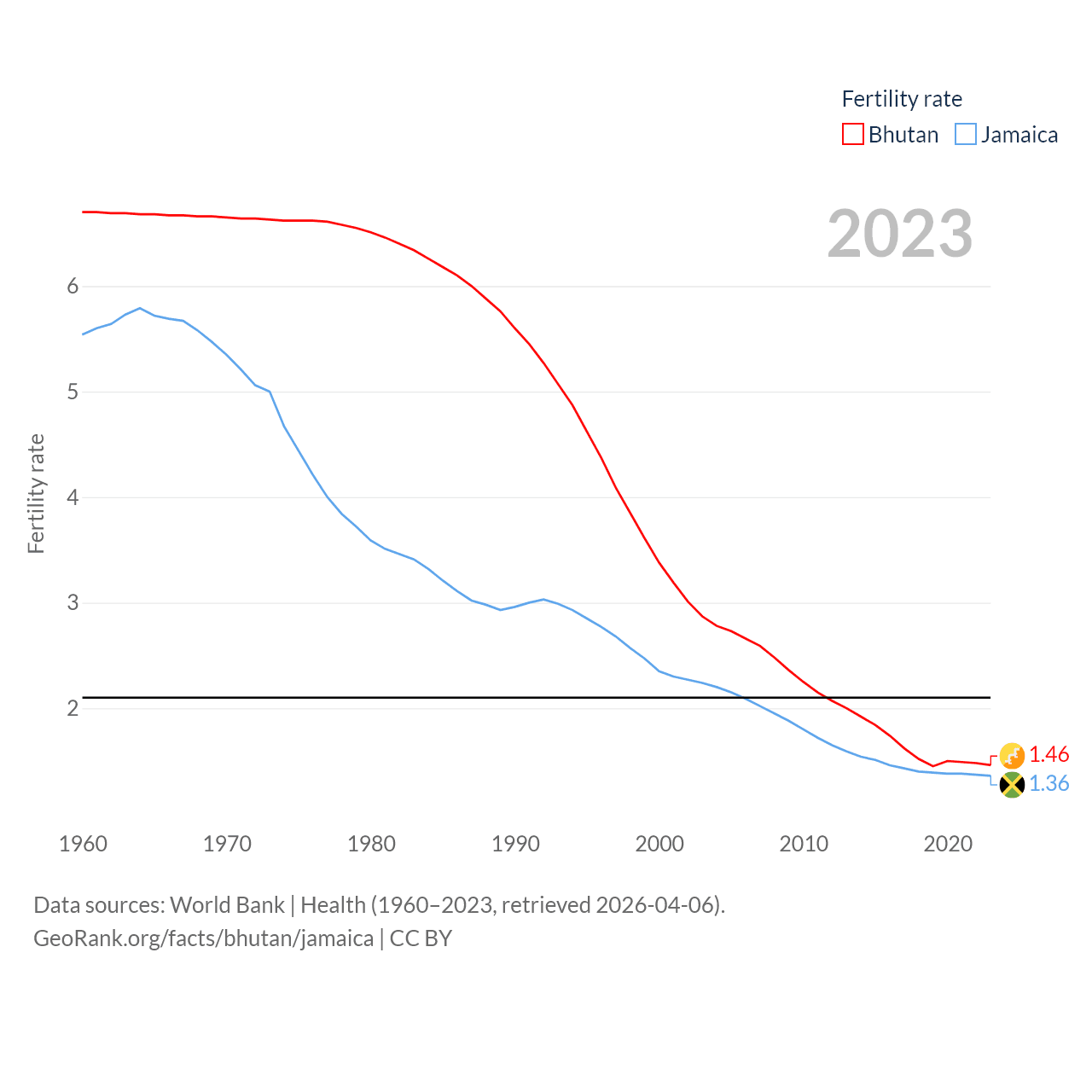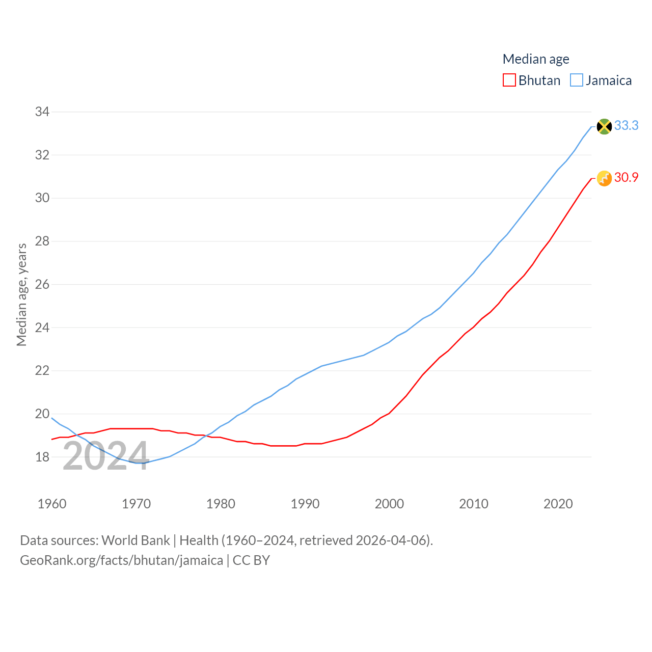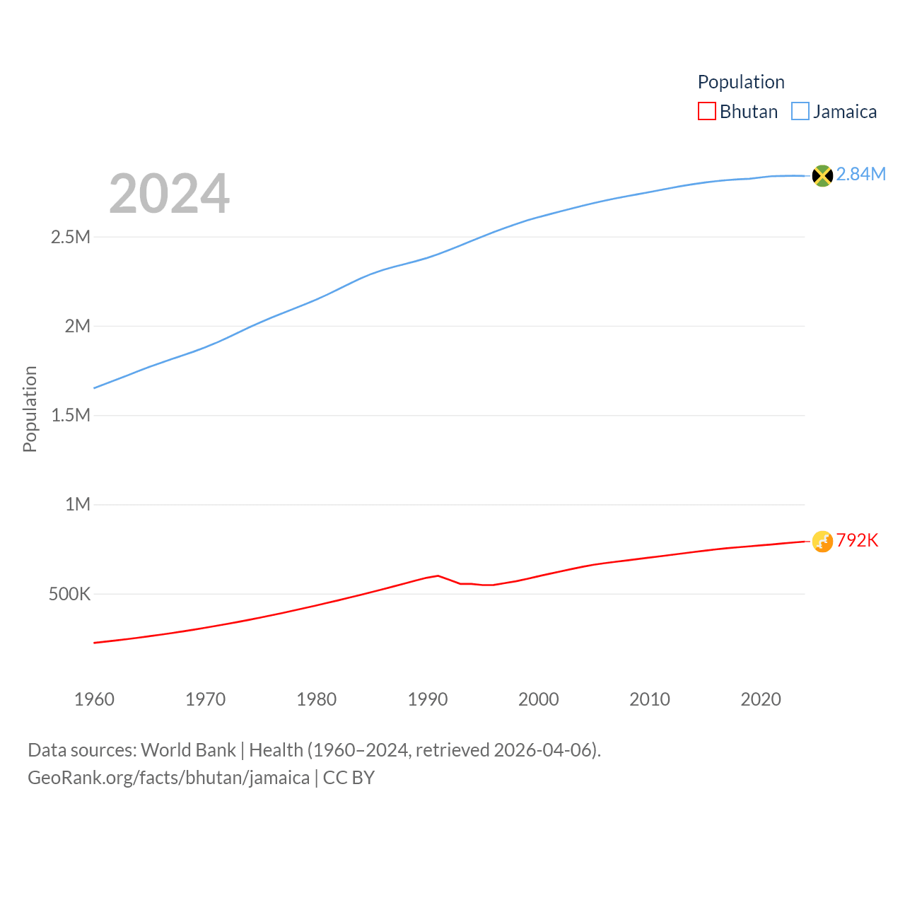 Bhutan has a population of 792K (ranked 163/197), compared with 2.84M in Jamaica (ranked 139/197). Bhutan's land area is 14,726 sq mi versus 4,181 sq mi for Jamaica (ranked 132nd vs. 159th).