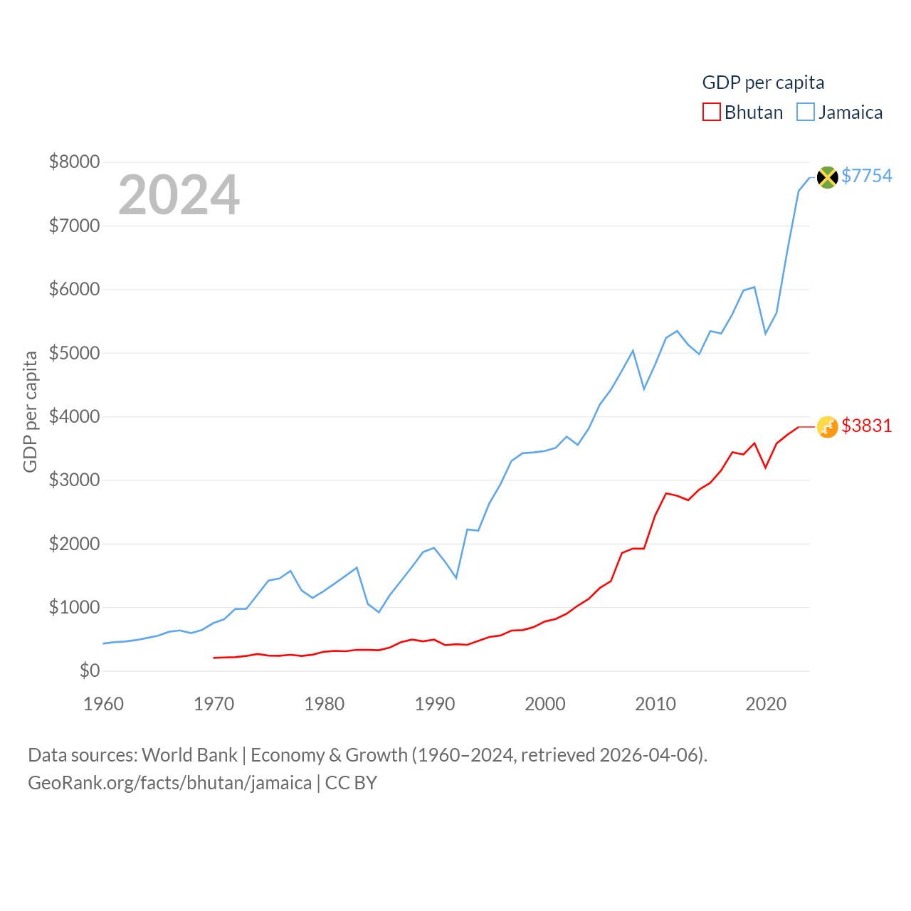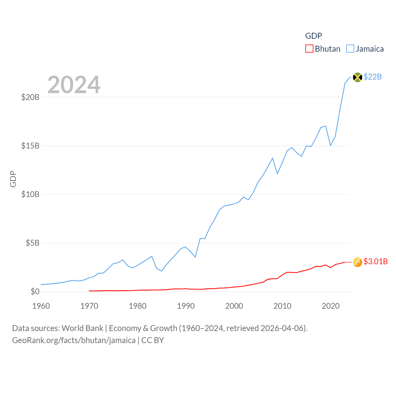 By GDP, Bhutan ranks 170/197 ($3.01B) and Jamaica ranks 124/197 ($22B). By GDP per capita, Bhutan ranks 132/197 ($3,831), while Jamaica ranks 95/197 ($7,754).