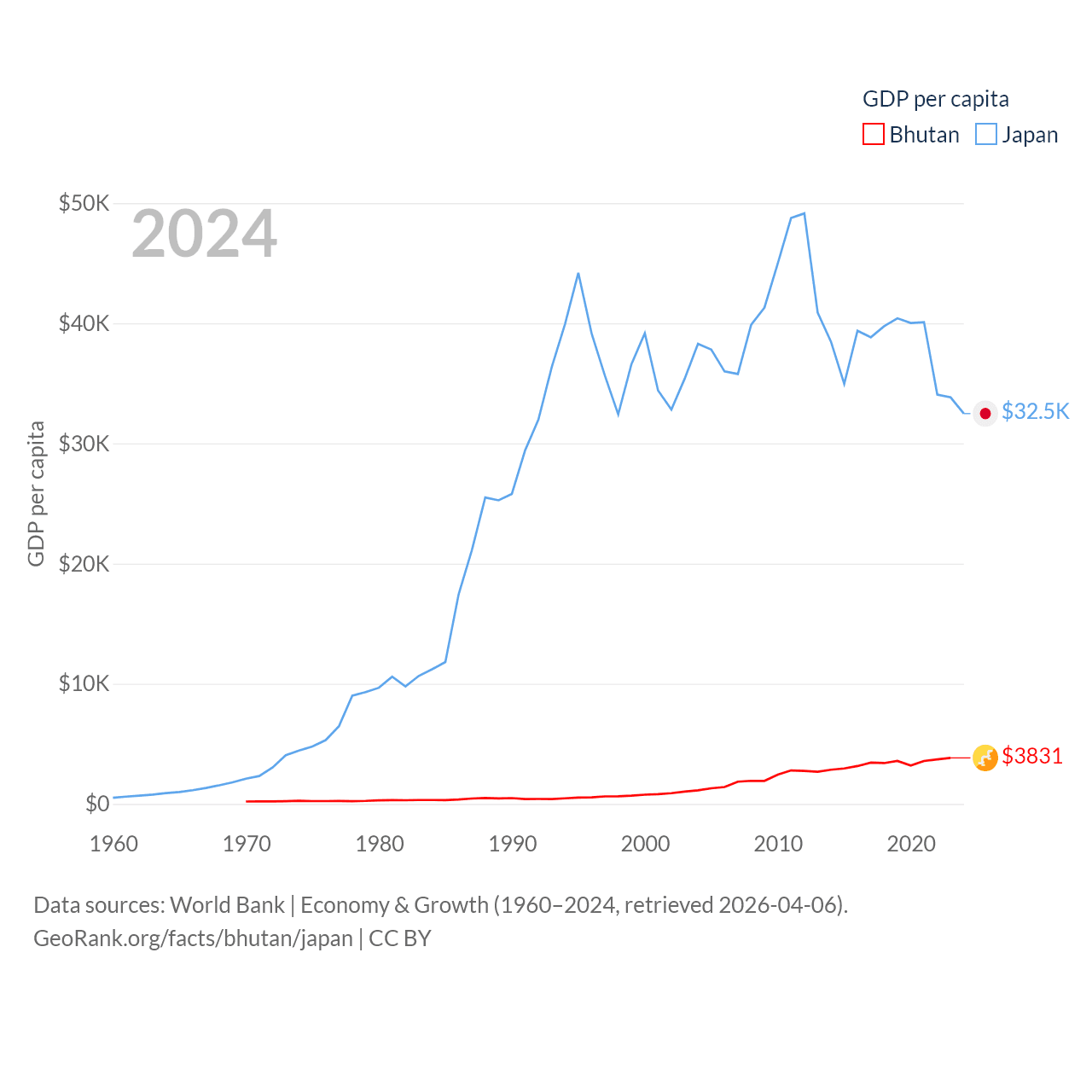 By GDP, Bhutan ranks 170/197 ($3.01B) and Japan ranks 4/197 ($4.03T). By GDP per capita, Bhutan ranks 132/197 ($3,831), while Japan ranks 38/197 ($32,487).