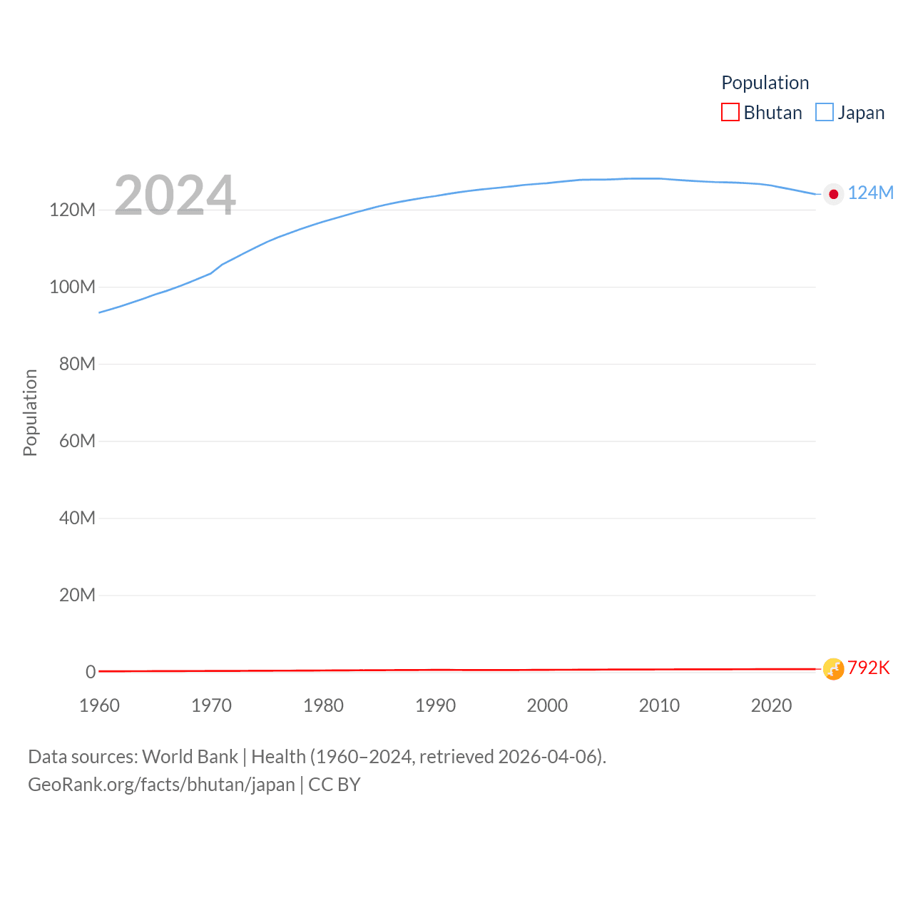 Bhutan has a population of 792K (ranked 163/197), compared with 124M in Japan (ranked 12/197). Bhutan's land area is 14,726 sq mi versus 140,761 sq mi for Japan (ranked 132nd vs. 61st).