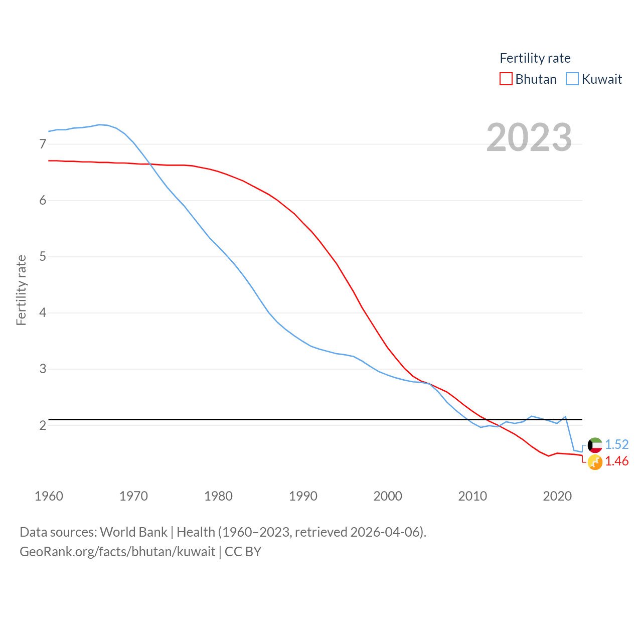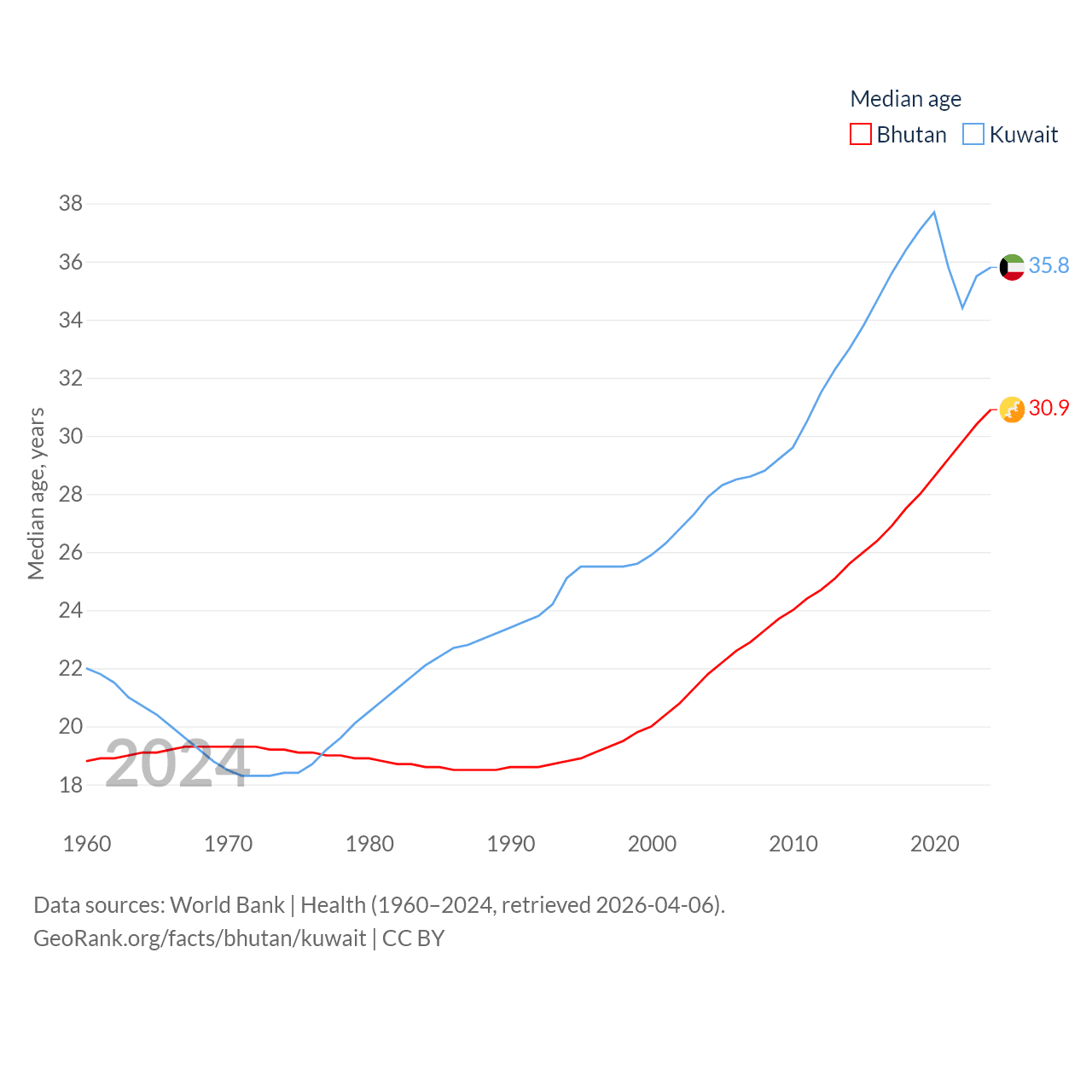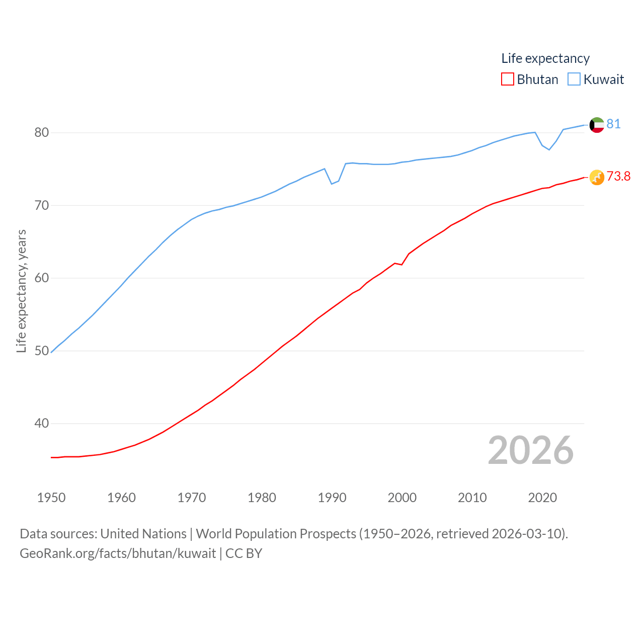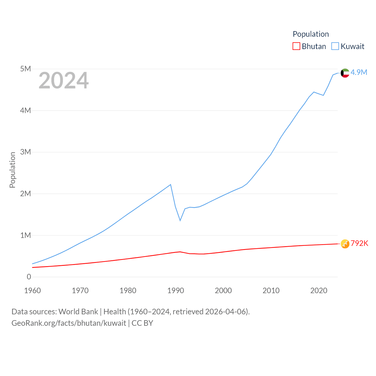 Bhutan has a population of 792K (ranked 163/197), compared with 4.9M in Kuwait (ranked 127/197). Bhutan's land area is 14,726 sq mi versus 6,880 sq mi for Kuwait (ranked 132nd vs. 153rd).