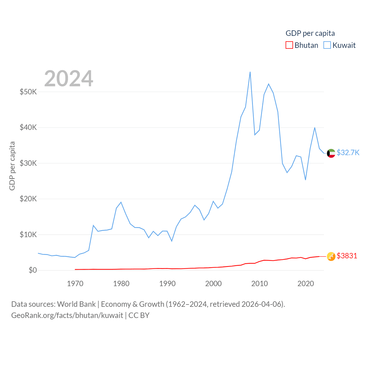 By GDP, Bhutan ranks 170/197 ($3.01B) and Kuwait ranks 59/197 ($160B). By GDP per capita, Bhutan ranks 132/197 ($3,831), while Kuwait ranks 37/197 ($32,718).