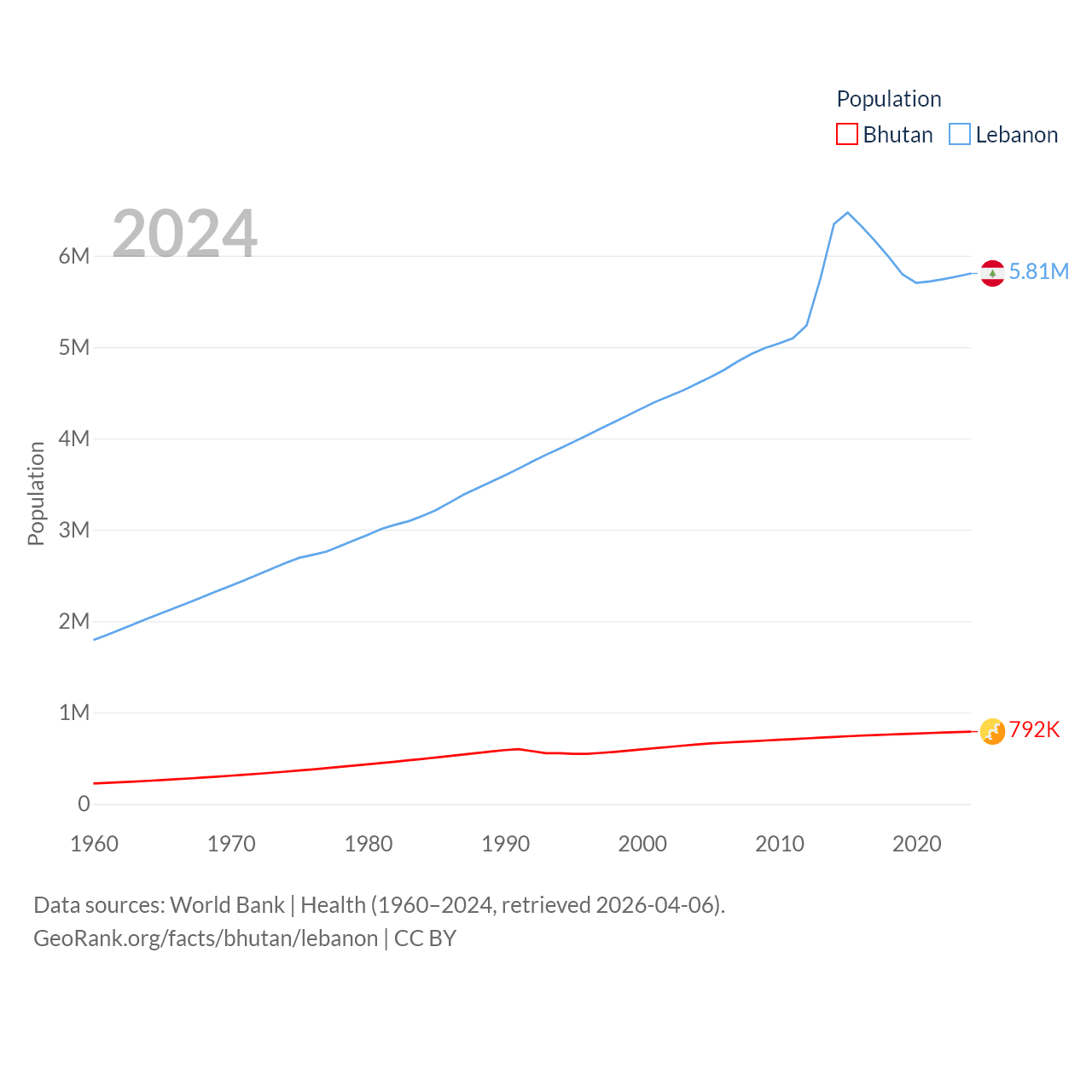 Bhutan has a population of 792K (ranked 163/197), compared with 5.81M in Lebanon (ranked 115/197). Bhutan's land area is 14,726 sq mi versus 3,950 sq mi for Lebanon (ranked 132nd vs. 160th).