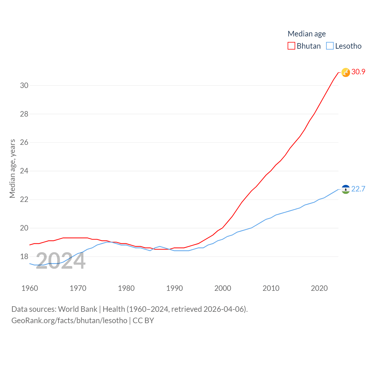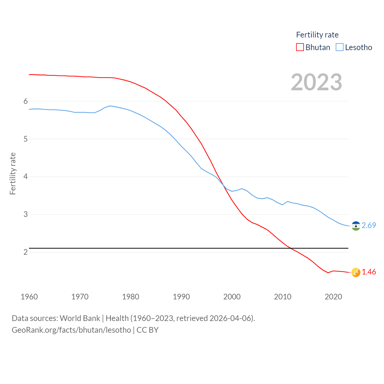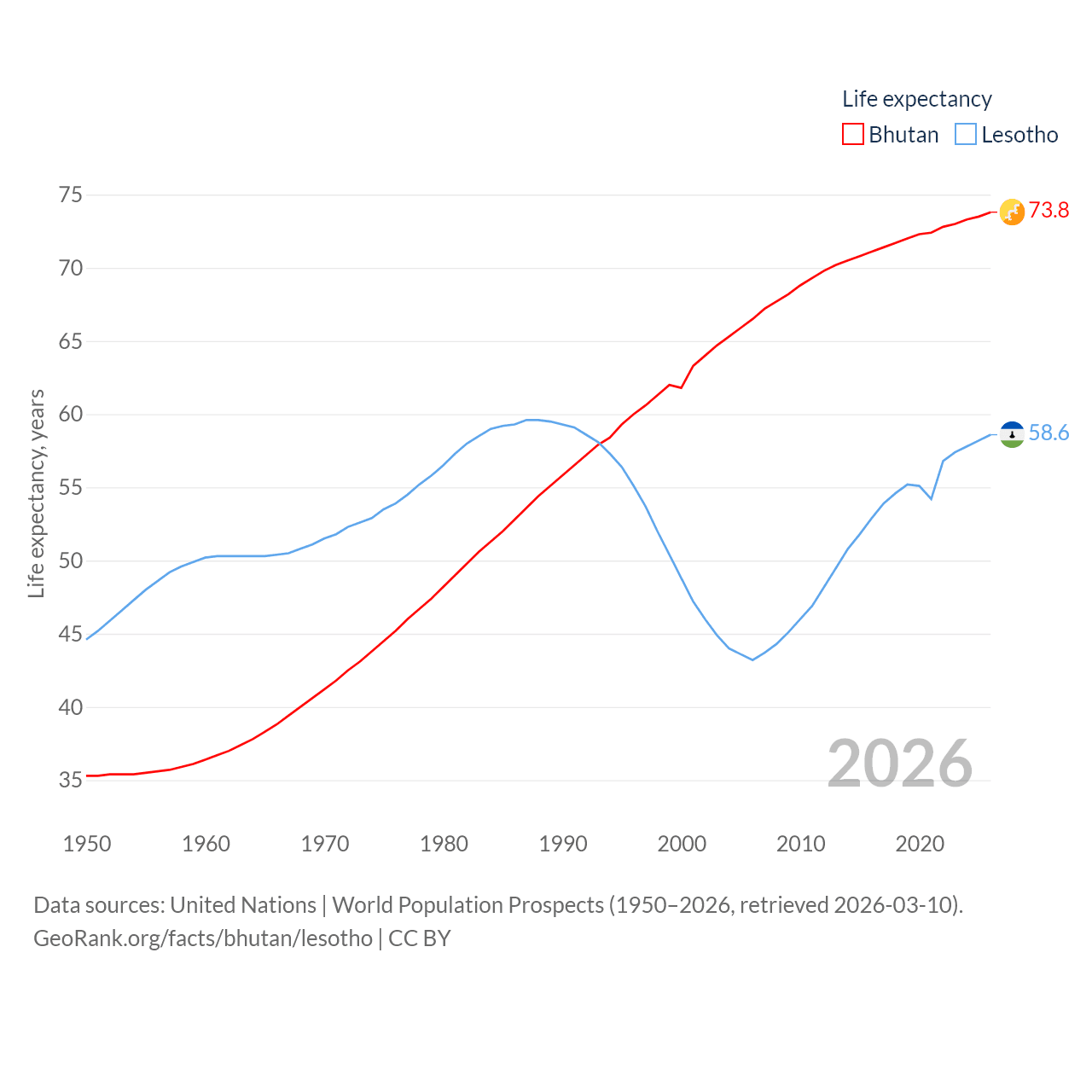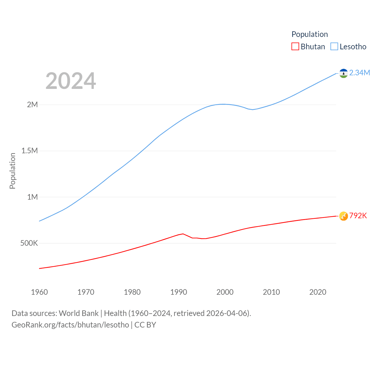 Bhutan has a population of 792K (ranked 163/197), compared with 2.34M in Lesotho (ranked 145/197). Bhutan's land area is 14,726 sq mi versus 11,722 sq mi for Lesotho (ranked 132nd vs. 137th).