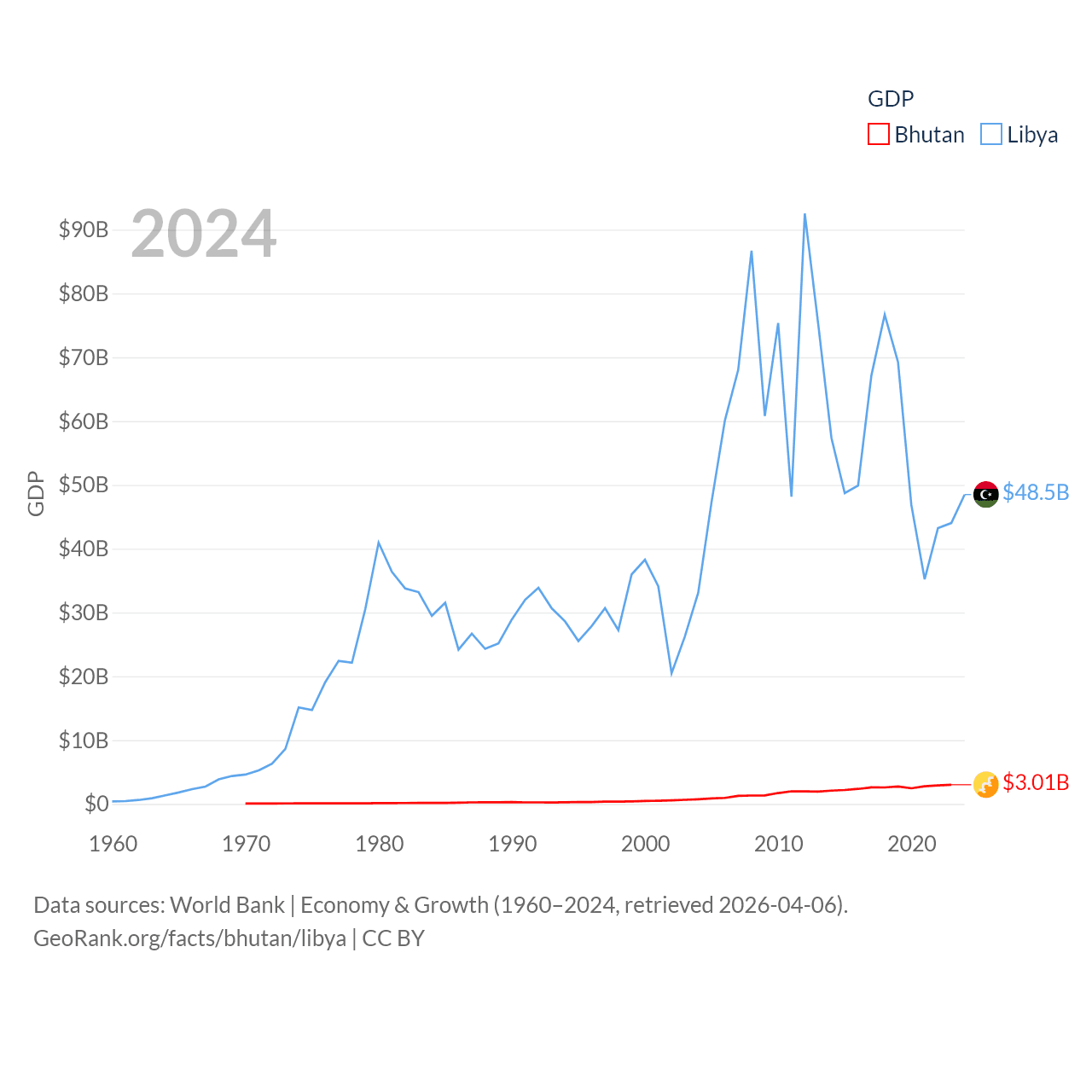 By GDP, Bhutan ranks 170/197 ($3.01B) and Libya ranks 95/197 ($48.5B). By GDP per capita, Bhutan ranks 132/197 ($3,831), while Libya ranks 107/197 ($6,569).