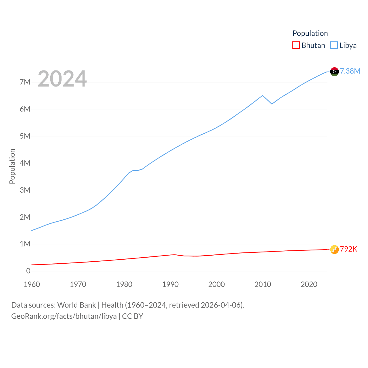Bhutan has a population of 792K (ranked 163/197), compared with 7.38M in Libya (ranked 105/197). Bhutan's land area is 14,726 sq mi versus 679,362 sq mi for Libya (ranked 132nd vs. 16th).