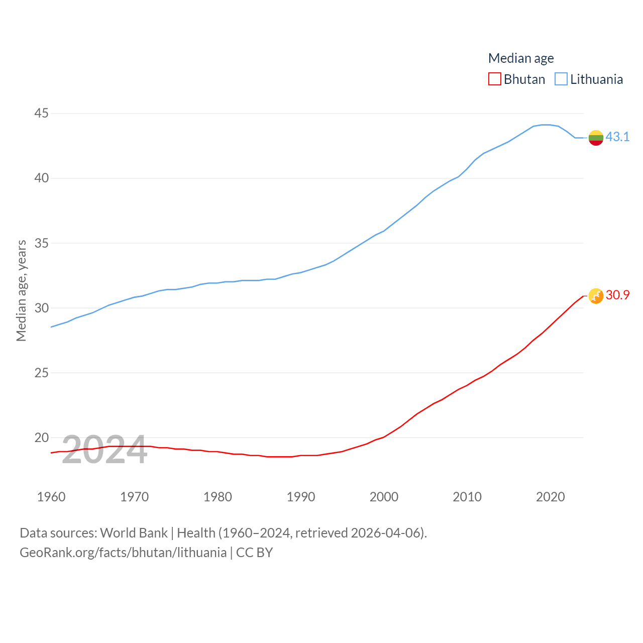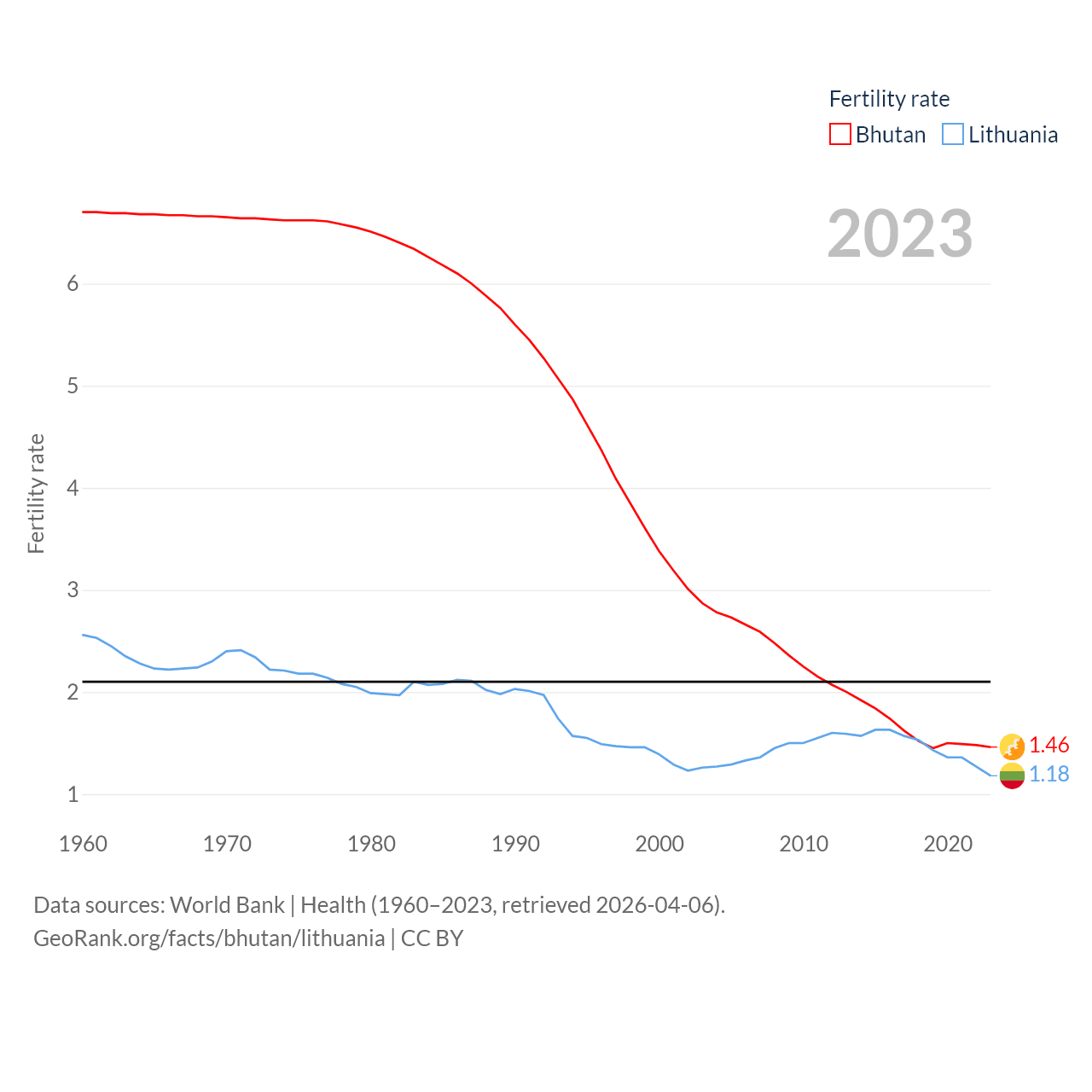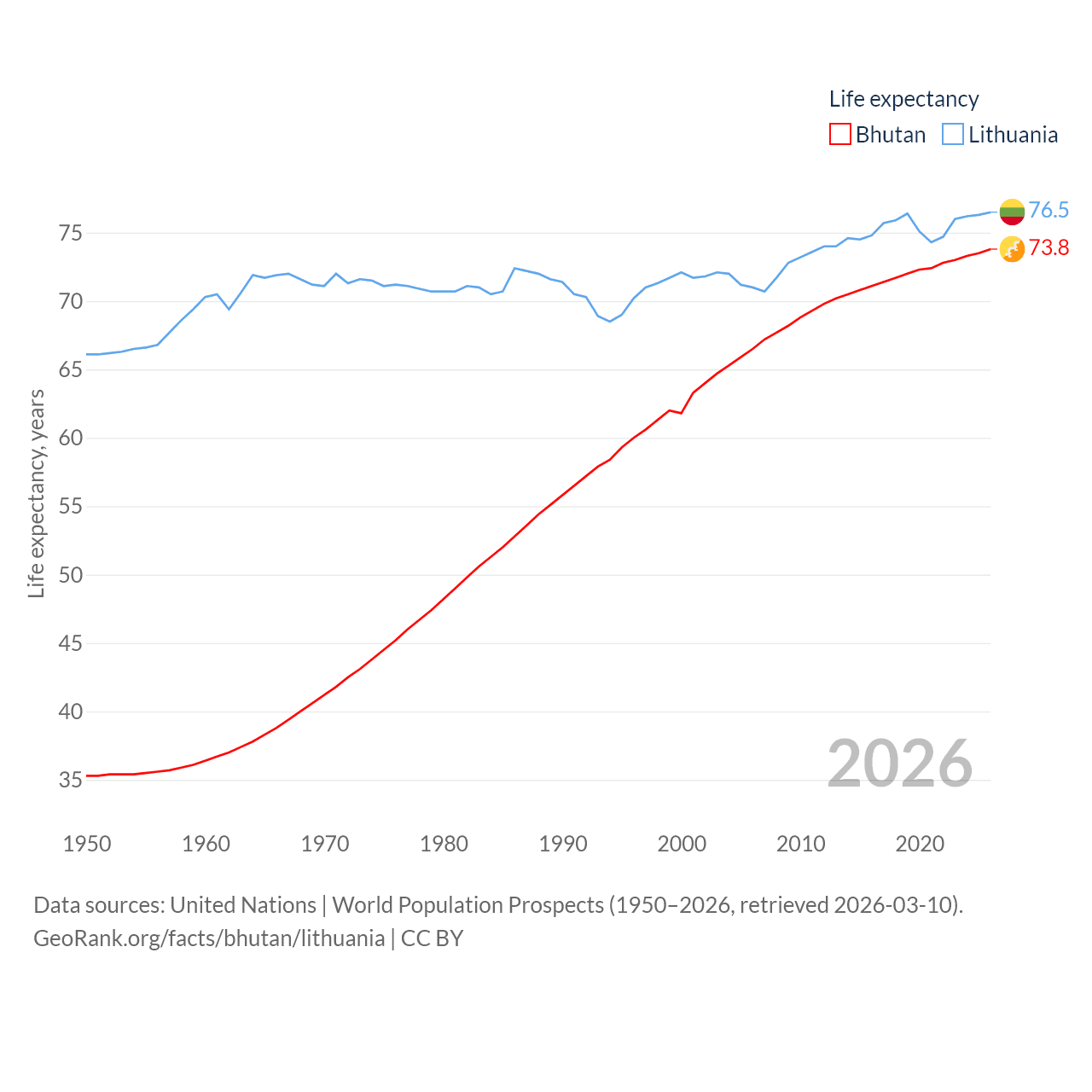 Bhutan has a population of 792K (ranked 163/197), compared with 2.89M in Lithuania (ranked 137/197). Bhutan's land area is 14,726 sq mi versus 24,170 sq mi for Lithuania (ranked 132nd vs. 120th).