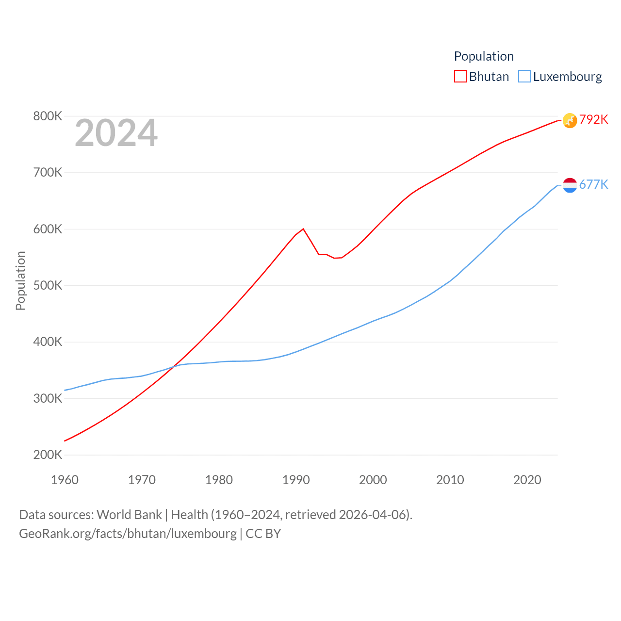 Bhutan has a population of 792K (ranked 163/197), compared with 677K in Luxembourg (ranked 164/197). Bhutan's land area is 14,726 sq mi versus 994 sq mi for Luxembourg (ranked 132nd vs. 169th).