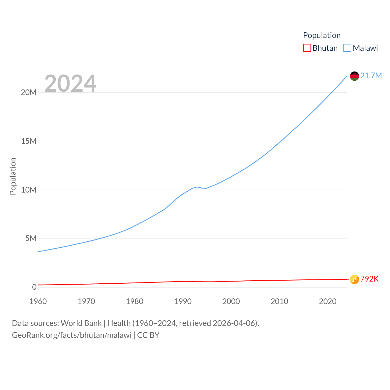 Bhutan has a population of 792K (ranked 163/197), compared with 21.7M in Malawi (ranked 62/197). Bhutan's land area is 14,726 sq mi versus 36,402 sq mi for Malawi (ranked 132nd vs. 107th).