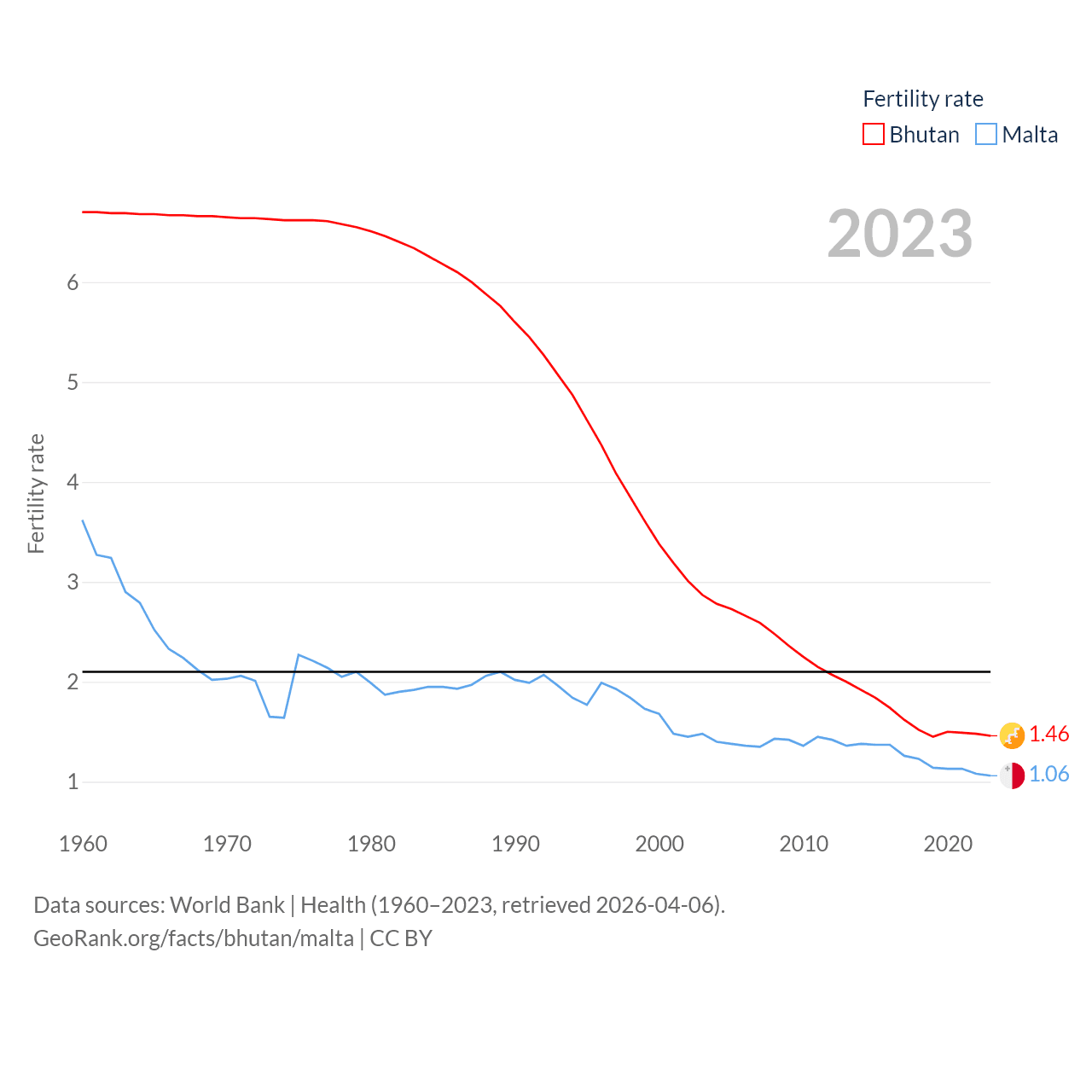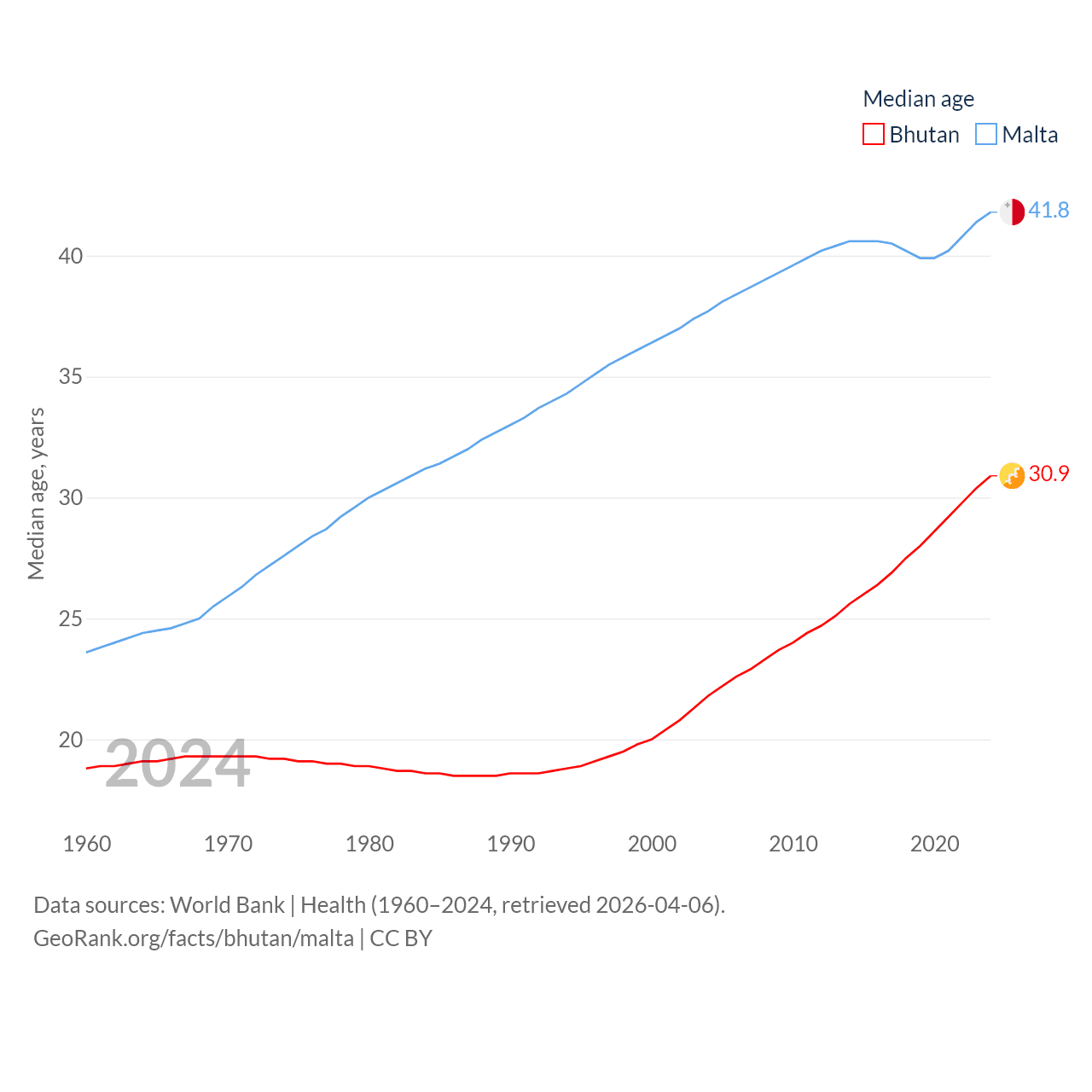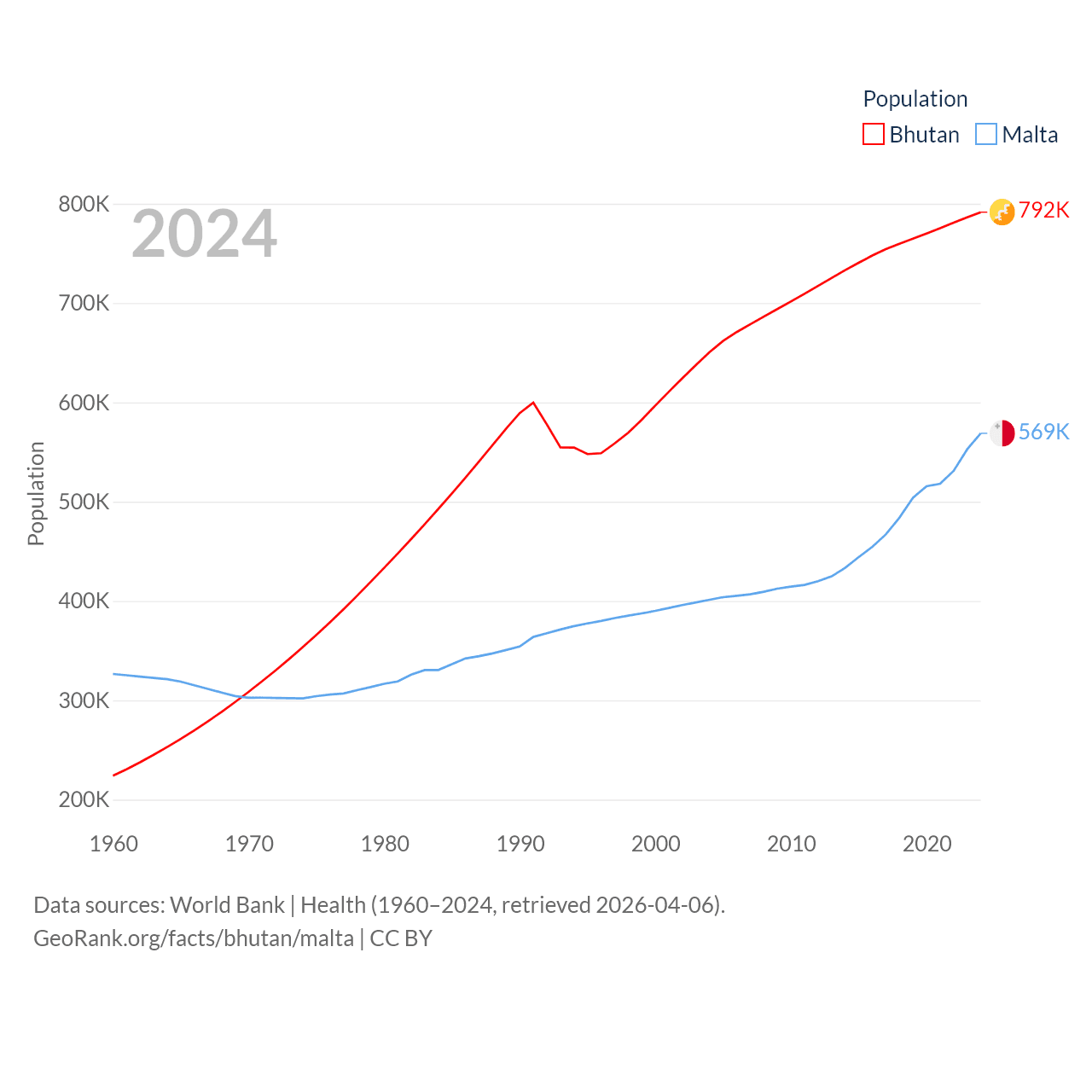 Bhutan has a population of 792K (ranked 163/197), compared with 569K in Malta (ranked 167/197). Bhutan's land area is 14,726 sq mi versus 123.6 sq mi for Malta (ranked 132nd vs. 187th).
