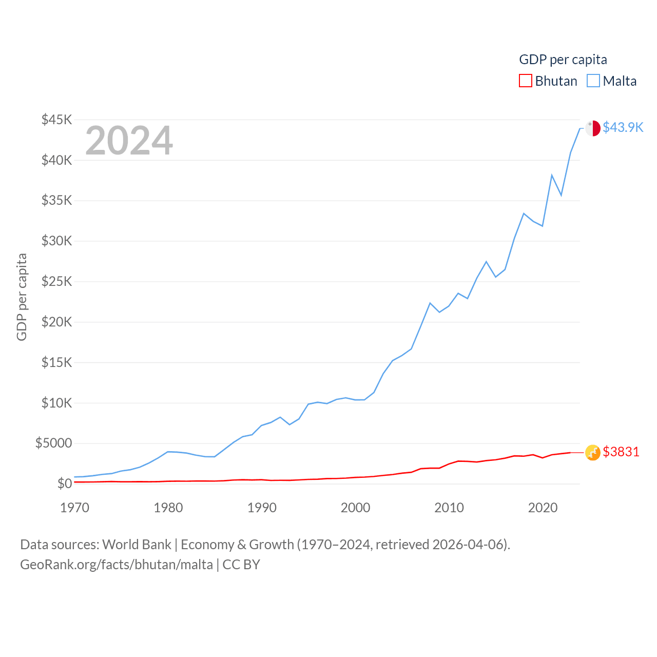 By GDP, Bhutan ranks 170/197 ($3.01B) and Malta ranks 119/197 ($25B). By GDP per capita, Bhutan ranks 132/197 ($3,831), while Malta ranks 28/197 ($43,899).