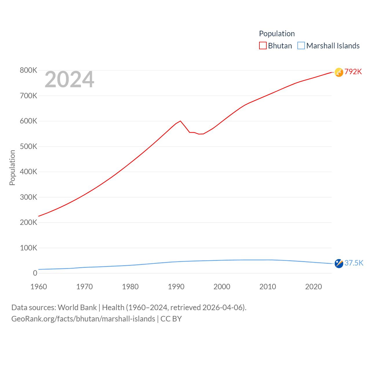 Bhutan has a population of 792K (ranked 163/197), compared with 37.5K in The Marshall Islands (ranked 192/197). Bhutan's land area is 14,726 sq mi versus 69.5 sq mi for The Marshall Islands (ranked 132nd vs. 191st).
