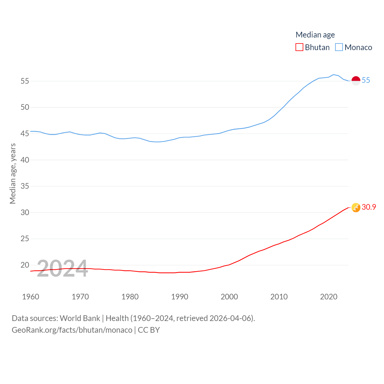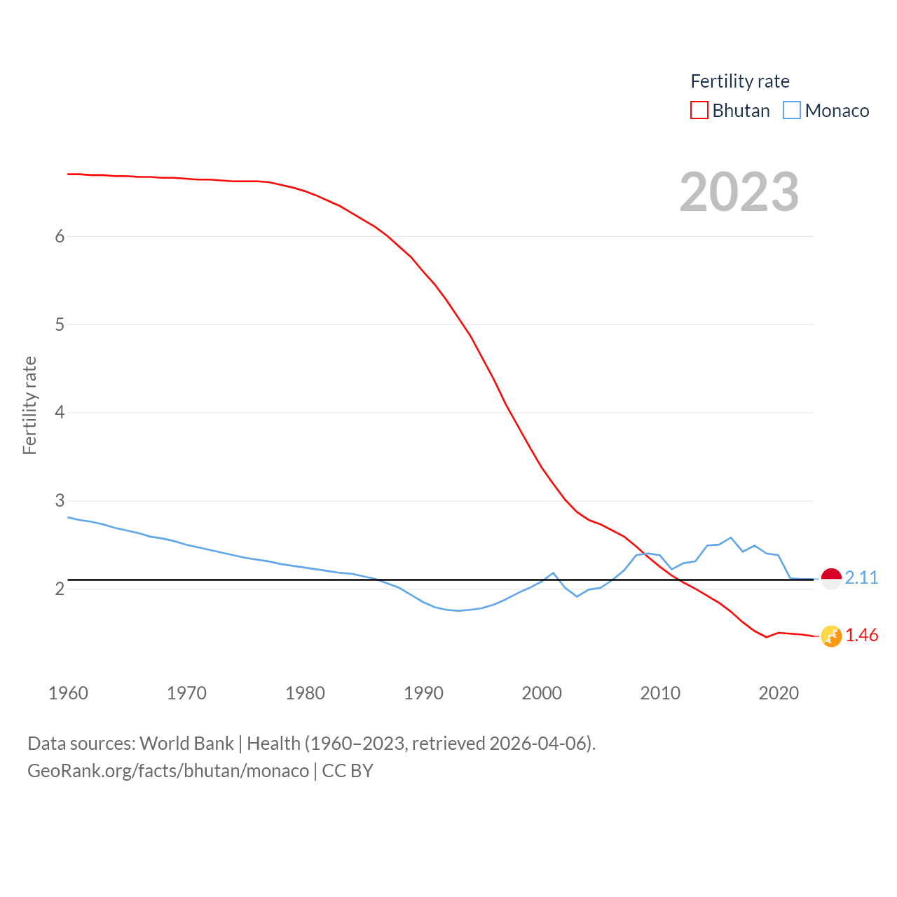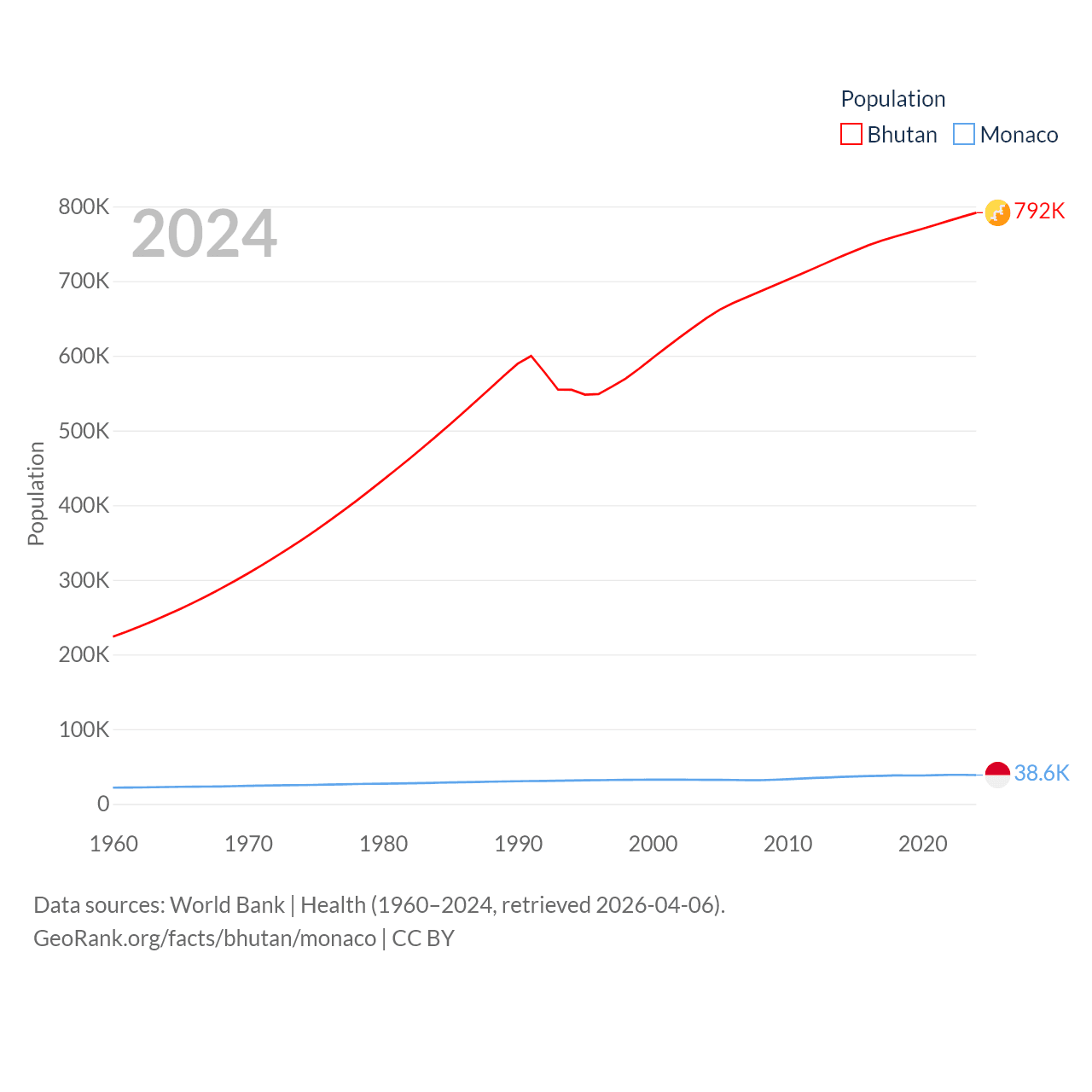 Bhutan has a population of 792K (ranked 163/197), compared with 38.6K in Monaco (ranked 191/197). Bhutan's land area is 14,726 sq mi versus 0.8 sq mi for Monaco (ranked 132nd vs. 196th).
