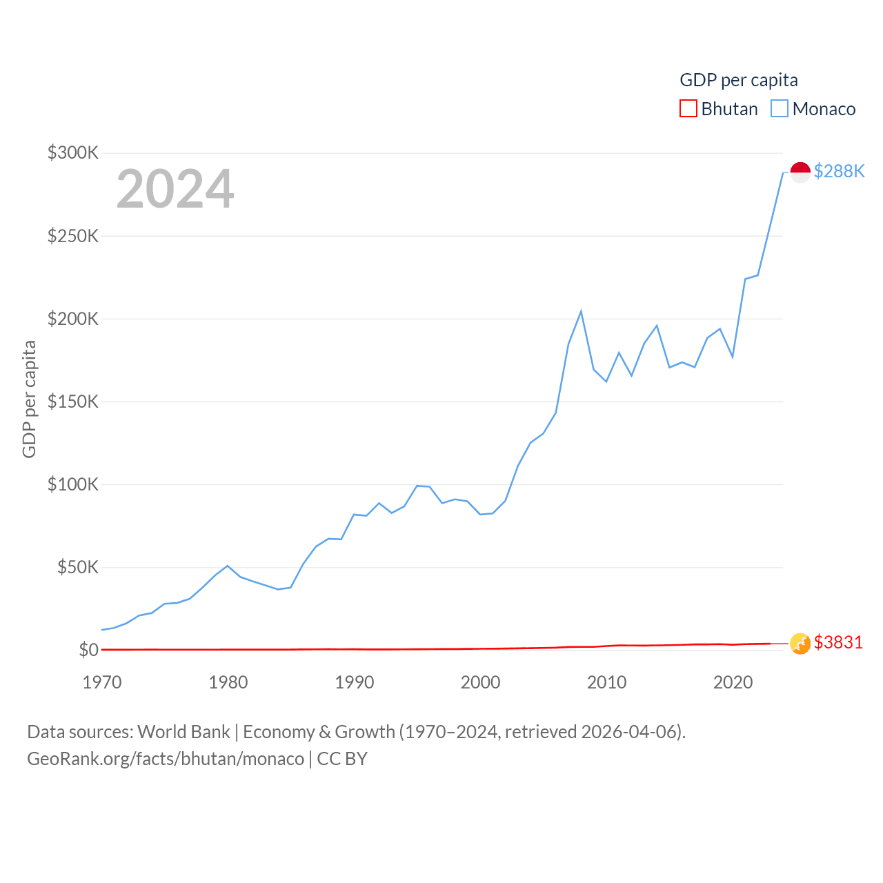 By GDP, Bhutan ranks 170/197 ($3.01B) and Monaco ranks 152/197 ($11.1B). By GDP per capita, Bhutan ranks 132/197 ($3,831), while Monaco ranks 1/197 ($288,001).