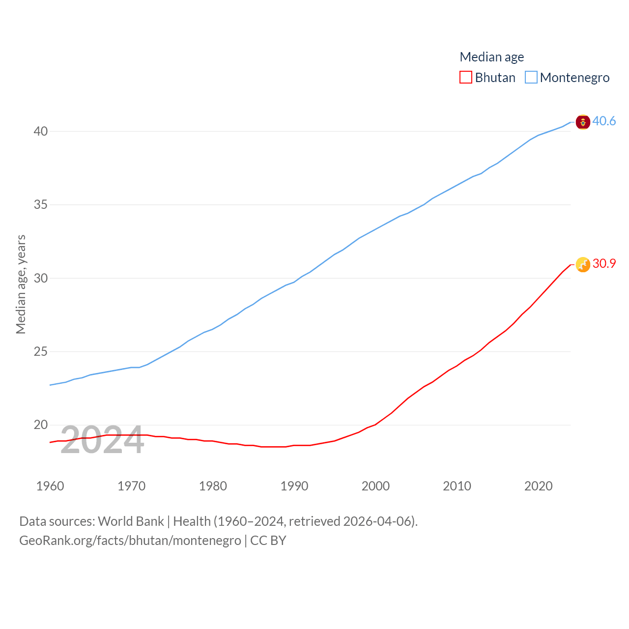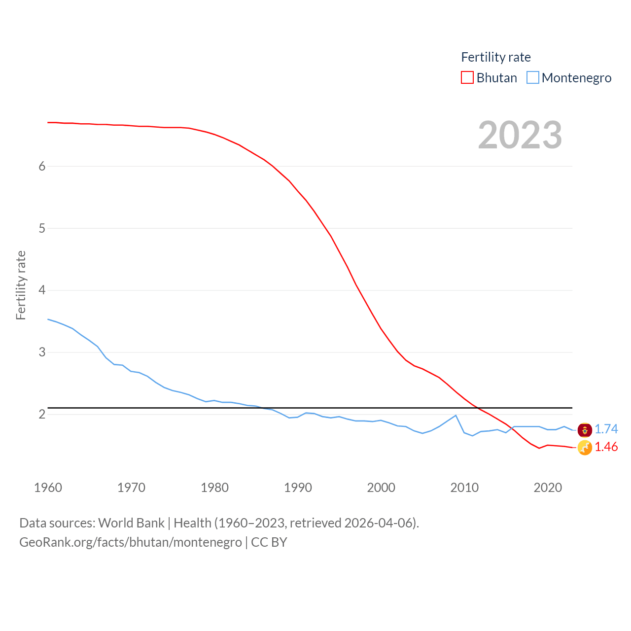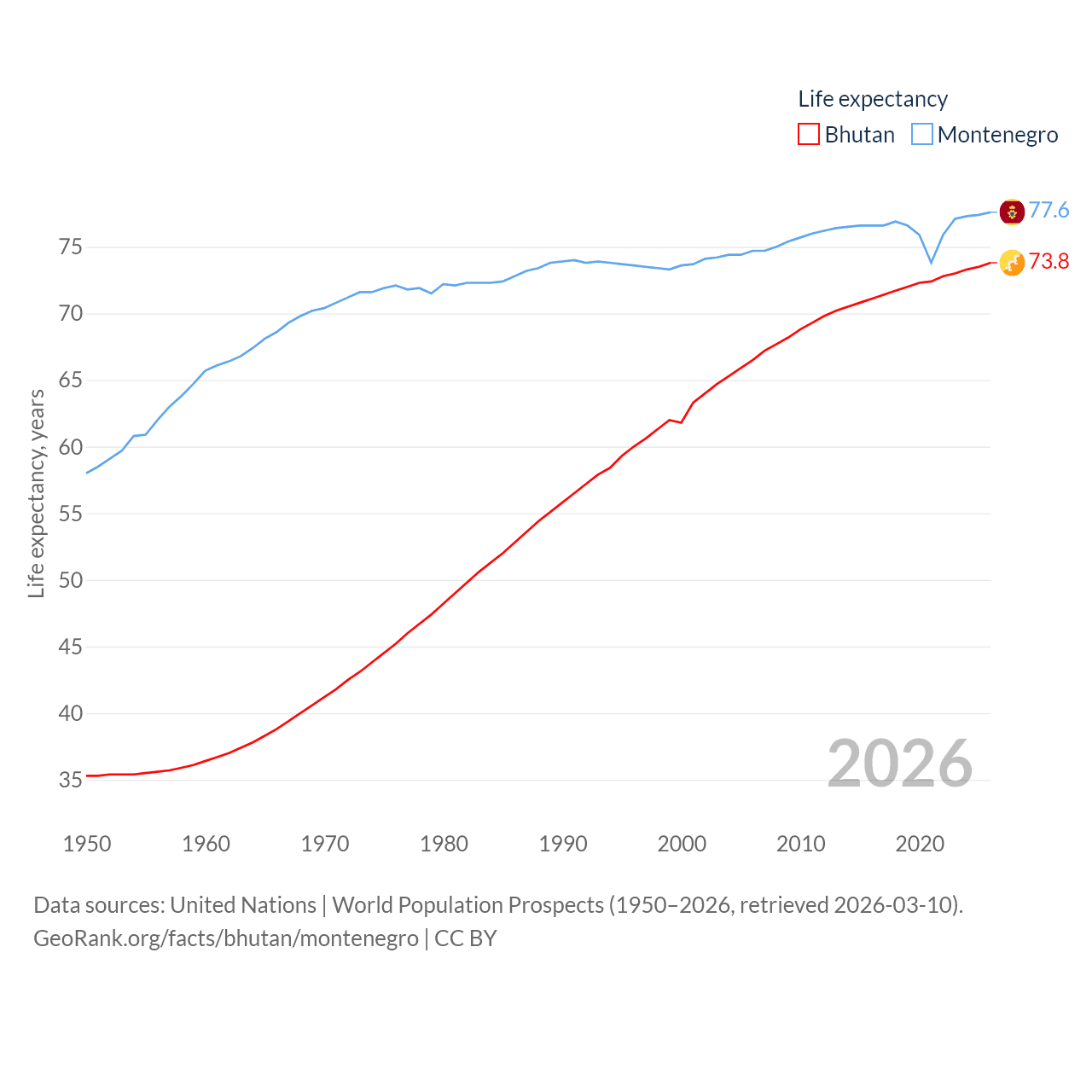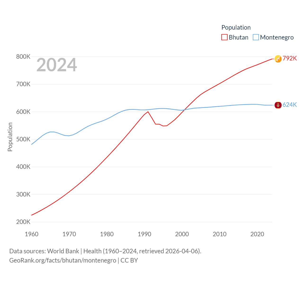 Bhutan has a population of 792K (ranked 163/197), compared with 624K in Montenegro (ranked 166/197). Bhutan's land area is 14,726 sq mi versus 5,193 sq mi for Montenegro (ranked 132nd vs. 156th).