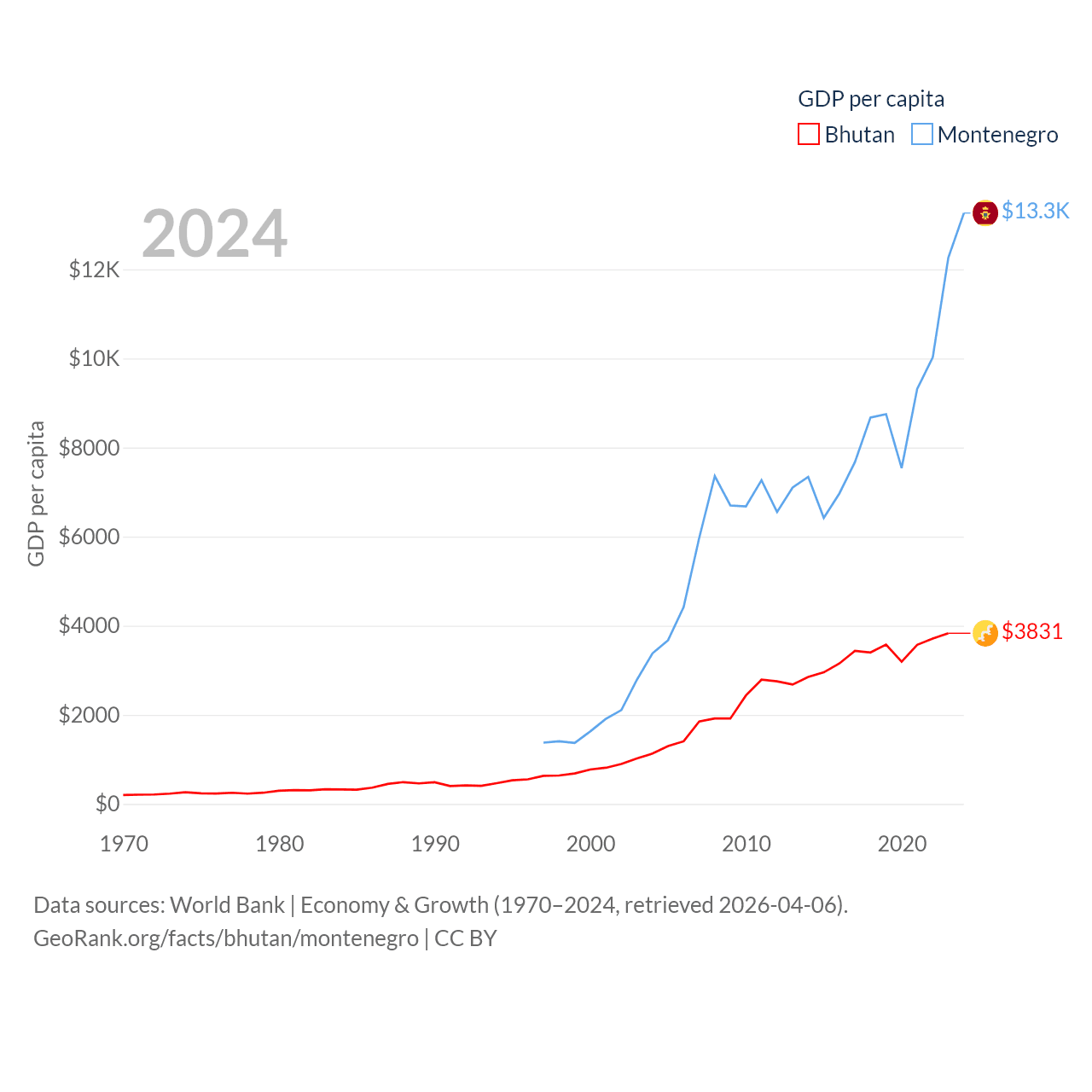 By GDP, Bhutan ranks 170/197 ($3.01B) and Montenegro ranks 155/197 ($8.27B). By GDP per capita, Bhutan ranks 132/197 ($3,831), while Montenegro ranks 77/197 ($13,263).
