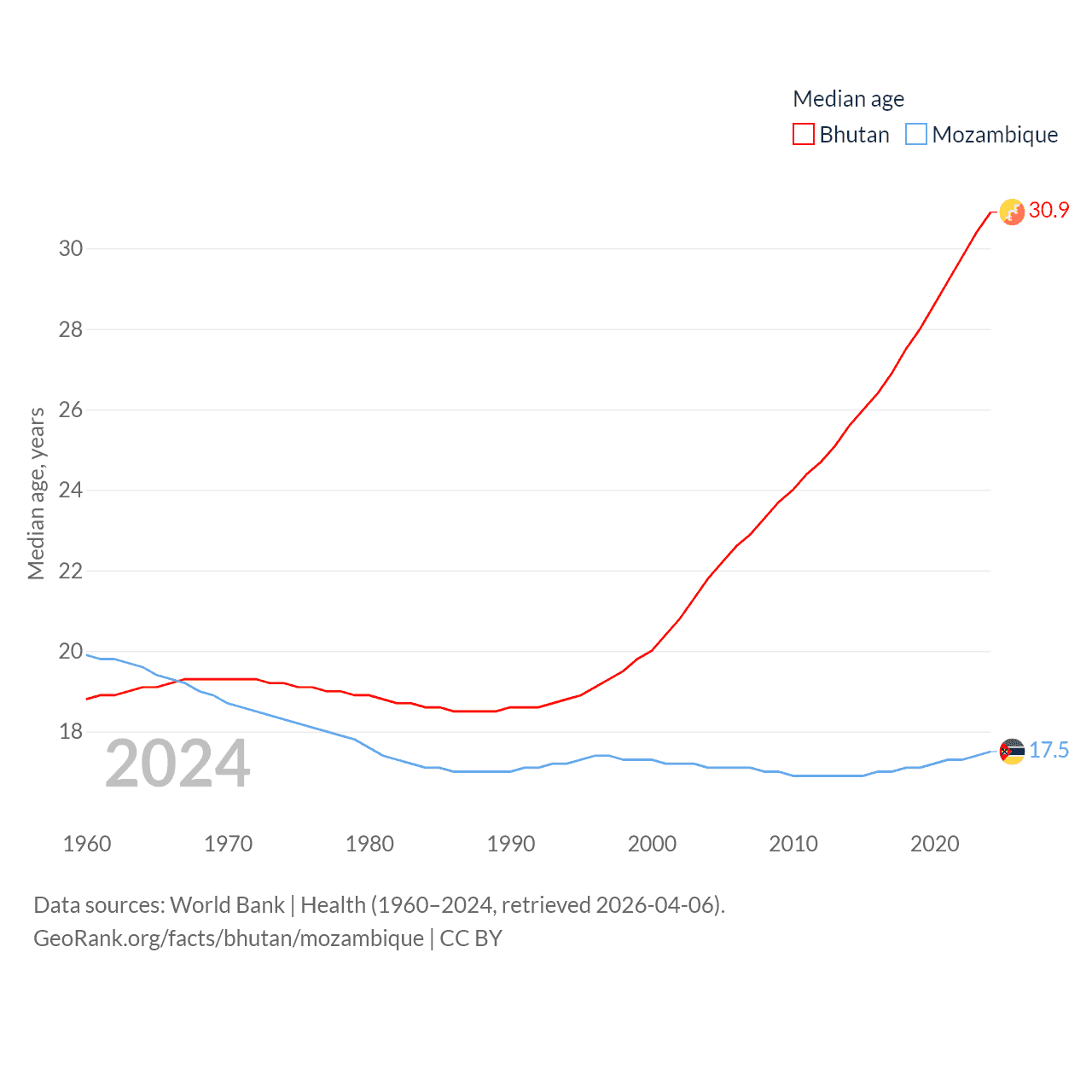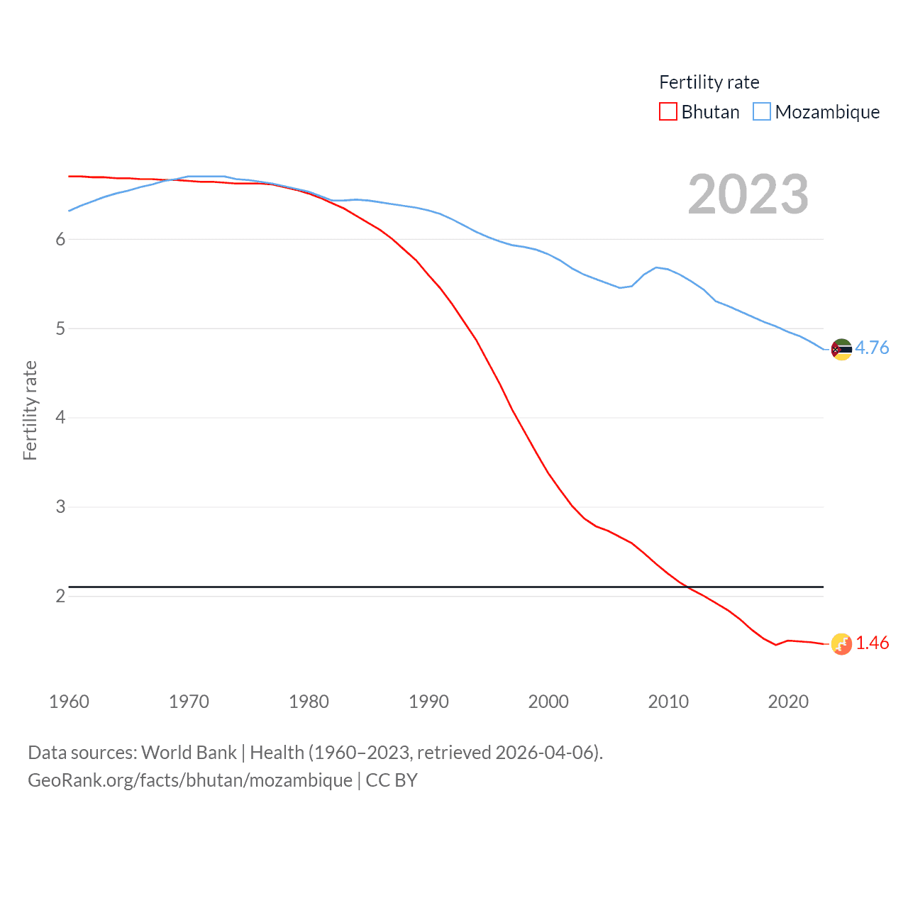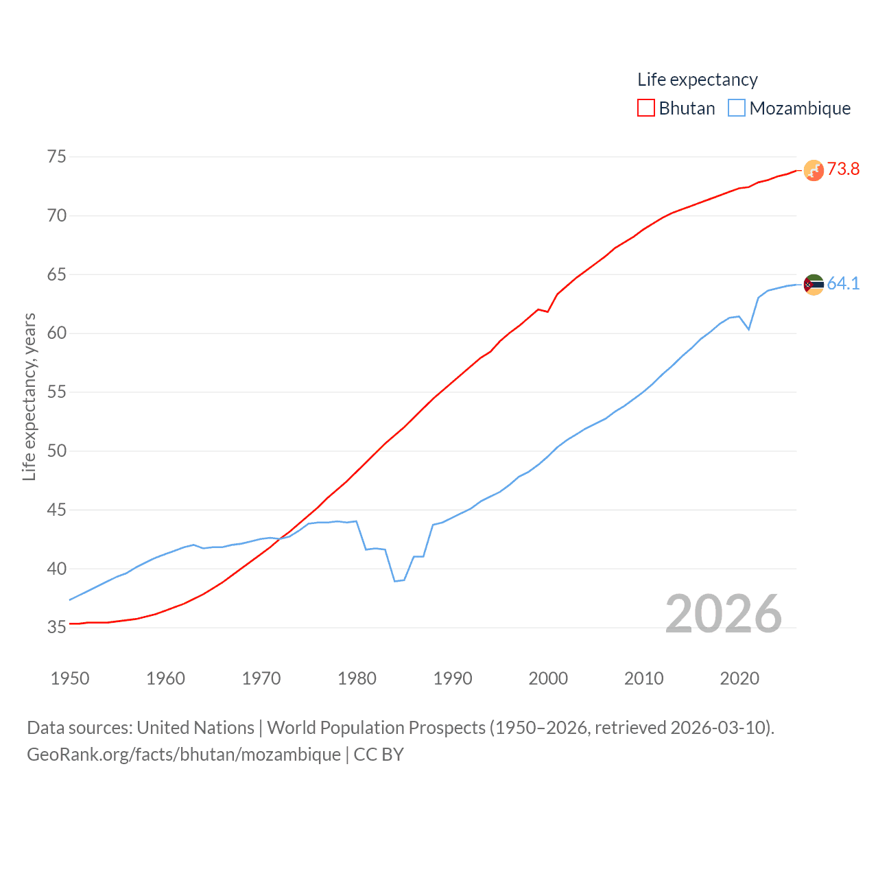 Bhutan has a population of 792K (ranked 163/197), compared with 34.6M in Mozambique (ranked 46/197). Bhutan's land area is 14,726 sq mi versus 303,623 sq mi for Mozambique (ranked 132nd vs. 34th).