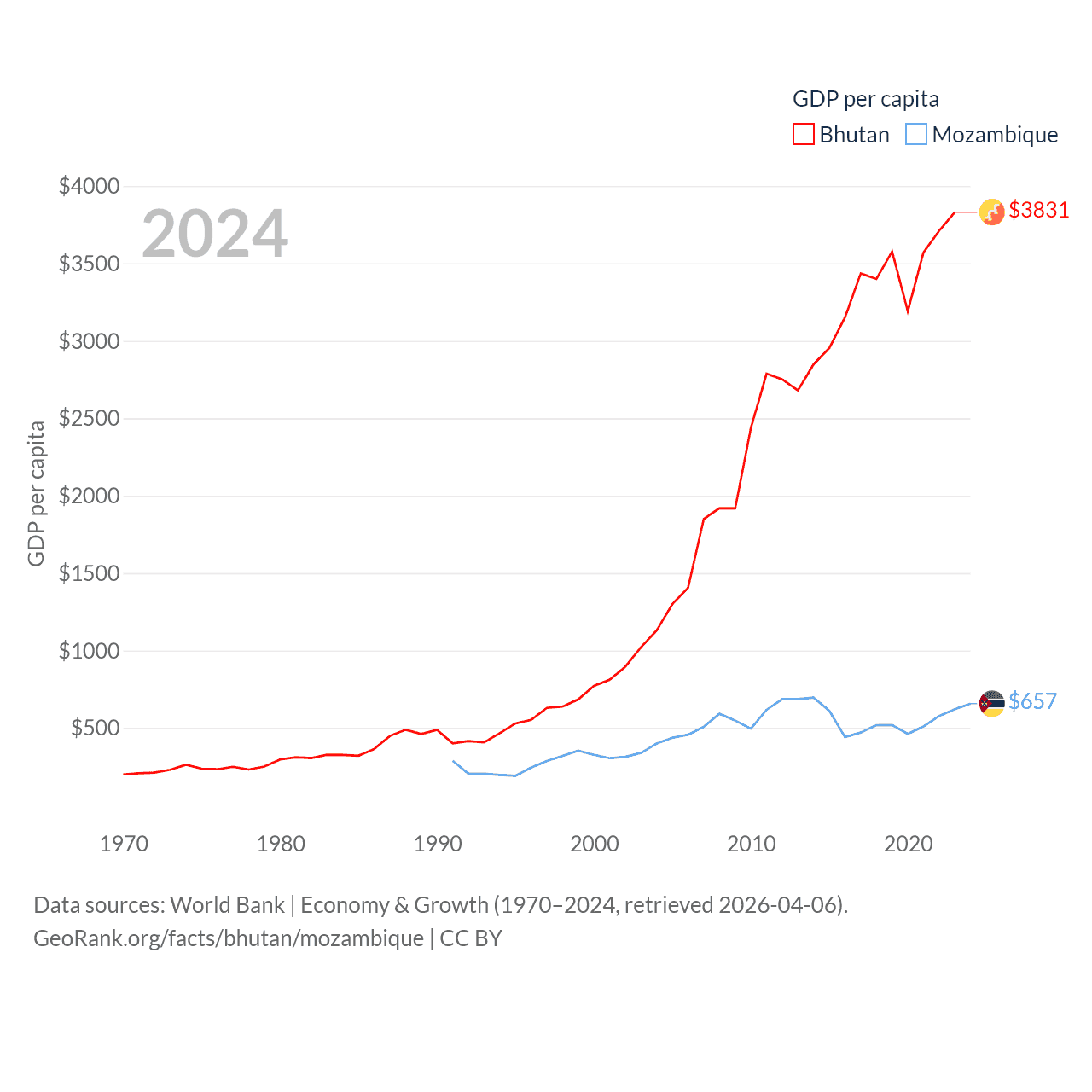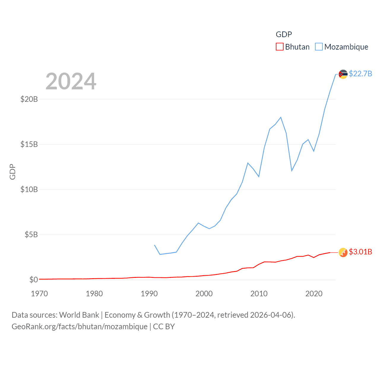 By GDP, Bhutan ranks 170/197 ($3.01B) and Mozambique ranks 123/197 ($22.7B). By GDP per capita, Bhutan ranks 132/197 ($3,831), while Mozambique ranks 189/197 ($657).